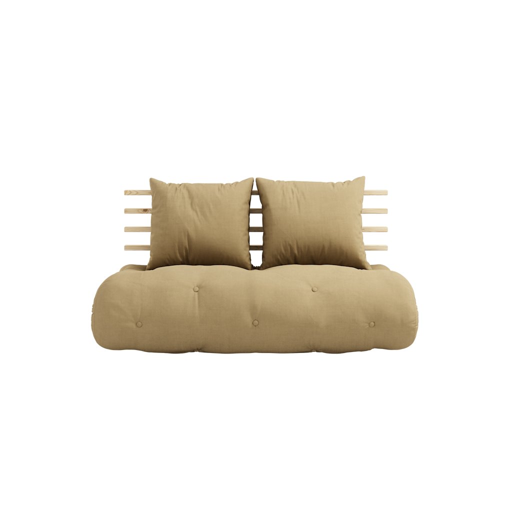 Dvoumístná rozkládací pohovka SHIN od výrobce stylového nábytku a pohovek KARUP DESIGN. Pohovka je vyrobena z vysoce kvalitního borovicového dřeva s certifikací FSC ve světlém provedení a futonové matrace s pěnovou výplní, kterou pokrývá bavlněný a polyesterový povlak v béžové barvě. Díky vysoké pružnosti matraci jednoduše rozložíte a dostanete lůžko s rozměry 140x200 cm. Praktický kus nábytku představuje nový přístup k minimalistickému stylu.