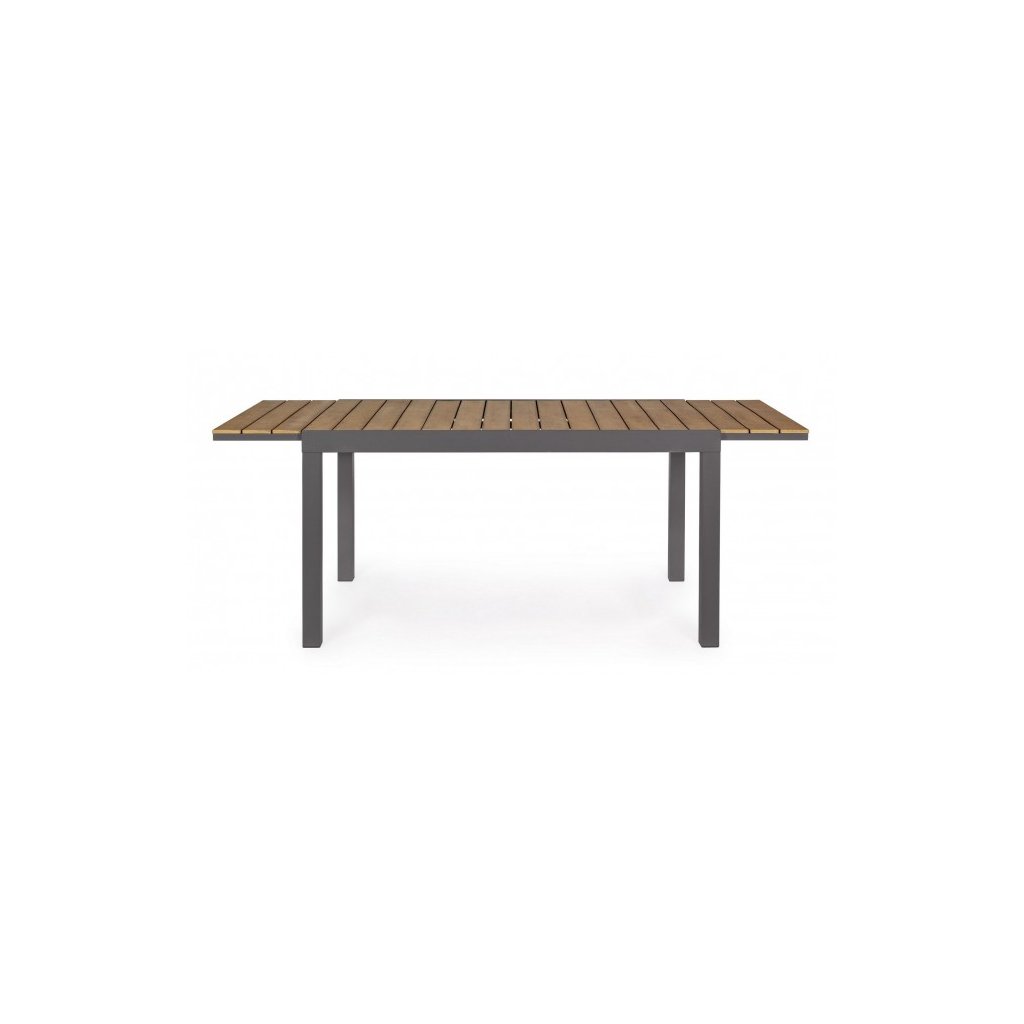 Stylový rozkládací zahradní stůl ELIAS od italského výrobce stylového nábytku BIZZOTTO. Stůl má 4 masivní nohy. které jsou vyrobeny z antracitově lakovaného hliníku, což dodává stolu stabilitu, odolnost proti povětrnostním podmínkám a nízkou váhu. Vrchní deska má primární rozměry 140x90cm, díky vnitřním dílu ji rozložíte na délku 200cm, a je tvořena z jednotlivých desek umělého dřeva POLYWOOD v barvě indického teaku. Díky tomu stůl můžete nechat téměř bez jakékoliv péče a obavy.