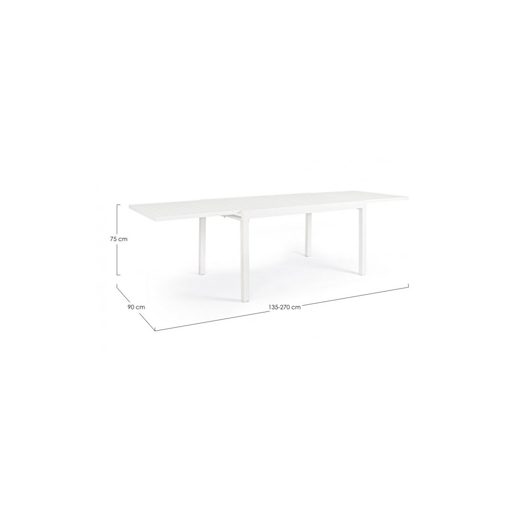 Designový venkovní stůl PELAGIUS od italského výrobce stylového nábytku BIZZOTTO. Stůl PELAGIUS je kompletně tvořen z hliníku v bílém odstínu. Hliníková konstrukce zajišťuje jeho maximální stabilitu a pevnost vůči venkovním vlivům. PELAGIUS je rozkládací s rozměry 135x90 centimetrů s možností rozložit desku až na 270 cm, čímž pojme až deset míst. Parádní pro venkovní grilování s rodinou či přáteli. Stůl je elegantní a stylový.