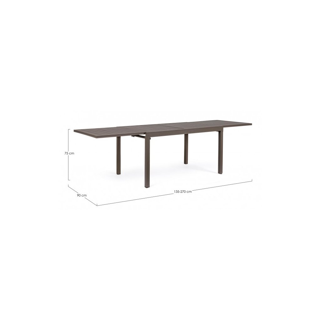 Designový venkovní stůl PELAGIUS od italského výrobce stylového nábytku BIZZOTTO. Stůl PELAGIUS je kompletně tvořen z hliníku v kávovém odstínu. Hliníková konstrukce zajišťuje jeho maximální stabilitu a pevnost vůči venkovním vlivům. PELAGIUS je rozkládací s rozměry 135x90 centimetrů s možností rozložit desku až na 270 cm, čímž pojme až deset míst. Parádní pro venkovní grilování s rodinou či přáteli. Stůl je elegantní a stylový.