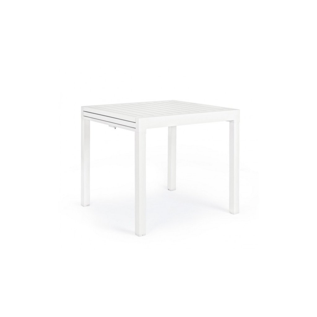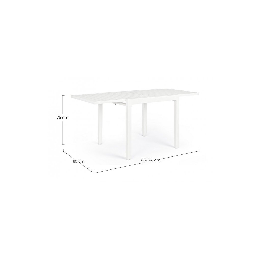 Designový venkovní stůl PELAGIUS od italského výrobce stylového nábytku BIZZOTTO. Stůl PELAGIUS je kompletně tvořen z hliníku v bílém odstínu. Hliníková konstrukce zajišťuje jeho maximální stabilitu a pevnost vůči venkovním vlivům. PELAGIUS je rozkládací s rozměry 83x80 centimetrů s možností rozložit desku až na 166 cm, čímž pojme až deset míst. Parádní pro venkovní grilování s rodinou či přáteli. Stůl je elegantní a stylový.