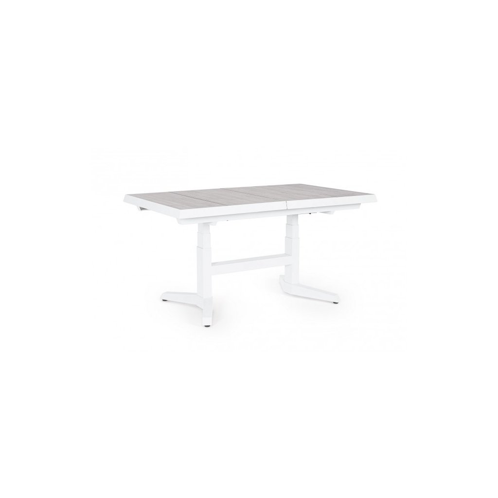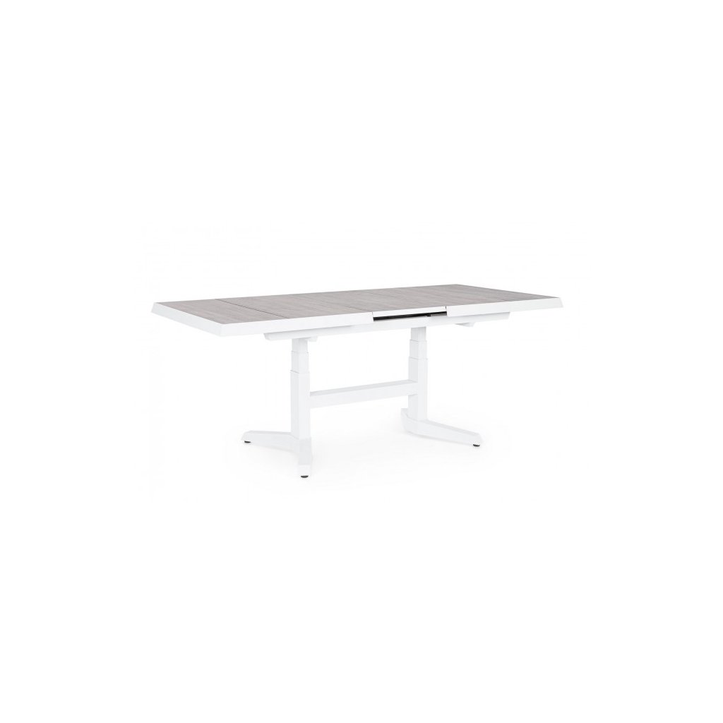 Rozkládací zahradní jídelní stůl ROBERT od italského výrobce stylového nábytku BIZZOTTO. Stůl je vyroben z práškově lakovaného hliníku, což zajišťuje jeho maximální pevnost, stabilitu a pevnost vůči venkovním vlivům. Spojovací šrouby jsou galvanizovány, takže se nemusíme bát koroze. Stůl má 2 propojené nohy, na nichž je rozkladatelná deska s délkou 143/183 cm a možností jednoduché změny výšky stolu na 53/75 cm, takže krásně usadíte 6-8 osob.