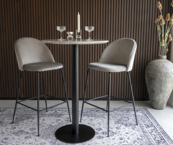 Designová barová židle LAUSANNE od dánské značky nádherného skandinávského nábytku HOUSE NORDIC . Židle se skládá ze 4 nohou z tenkého kovu v černé barvě, které jsou navzájem mezi sebou propojeny, což zajišťuje LAUSANNE maximální stabilitu a pevnost. Vrchní jednodílný sedák je potažen velmi příjemným potahem v šedém sametu a se zajímavým a stylovým vyšíváním na zadní straně.