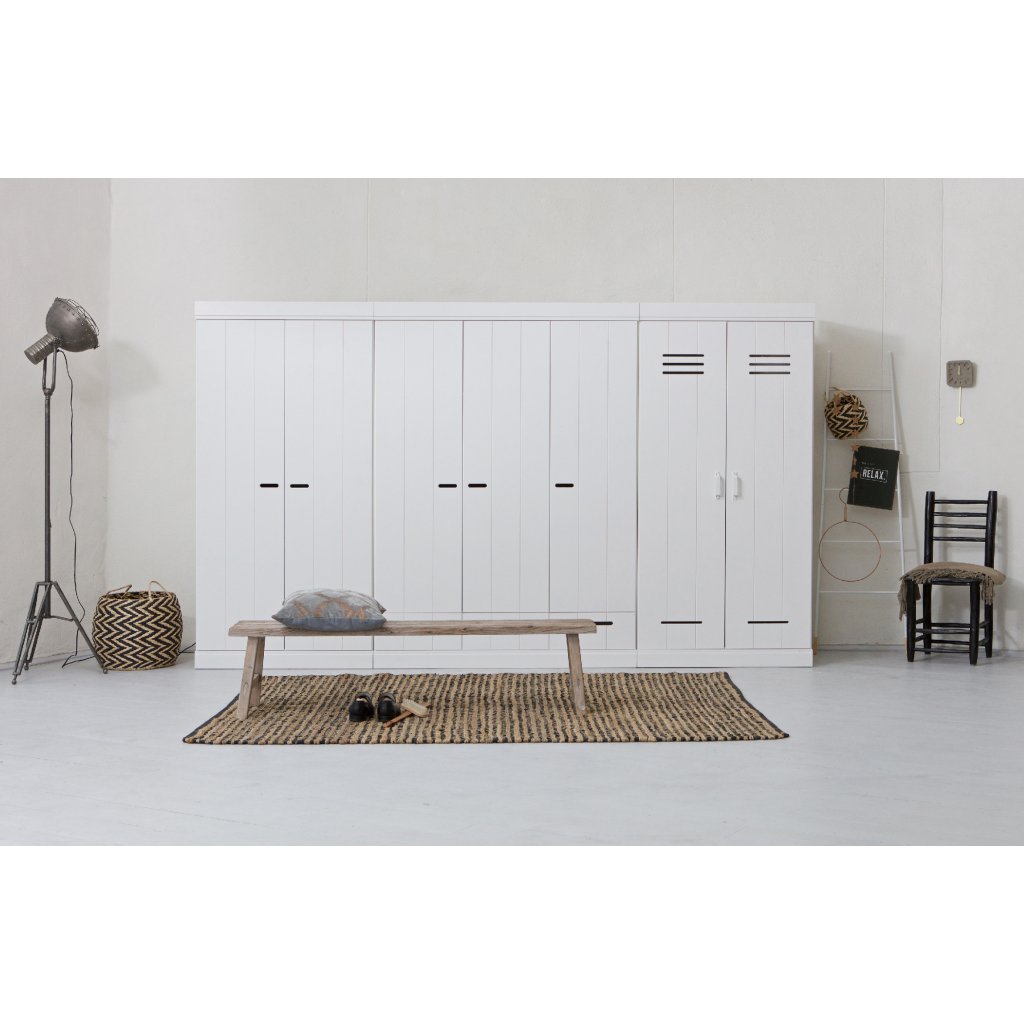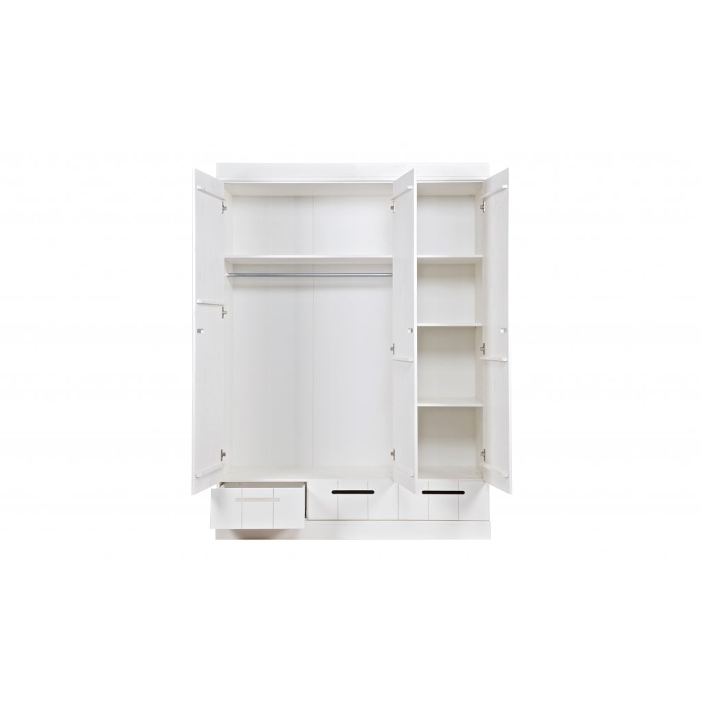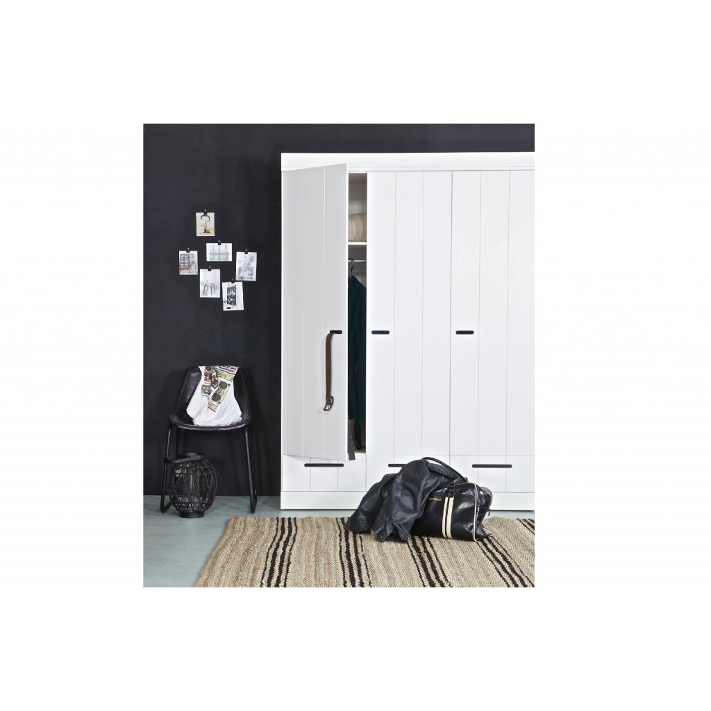 Designová šatní skříň ROW od holandského výrobce nábytku WOOOD. Skříň CONNECT tvoří konstrukce a boční desky z masivního dřeva borovice zajišťující skříni maximální stabilitu. Přední část představují 3 krásné dveře s jemnými rýhami, které svisle dělí jednotlivé dveře na tři části. Za nimi se skrývá úložný prostor rozdělený na jednotlivé police. Vnitřní přepážky jsou vyrobeny z dřevovláknité mdf desky se stejnou bílou barvou. Skříň má navíc v dolní části tři praktické zásuvky na drobné věci. Dřevo se pyšní certifikátem FSC, což značí ekologickou a k přírodě šetrnou těžbu dřeva a jde tak o ekologický výrobek.
