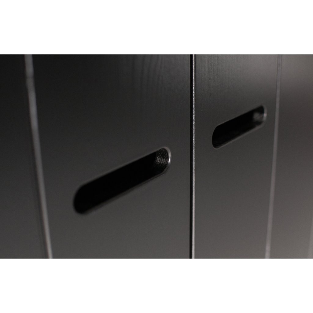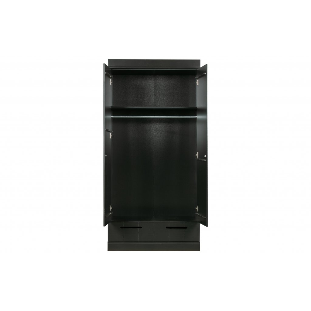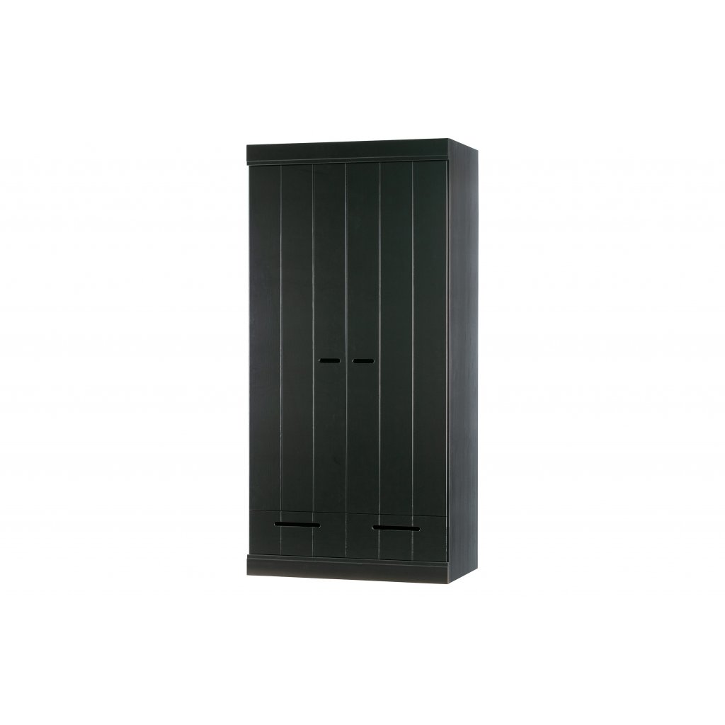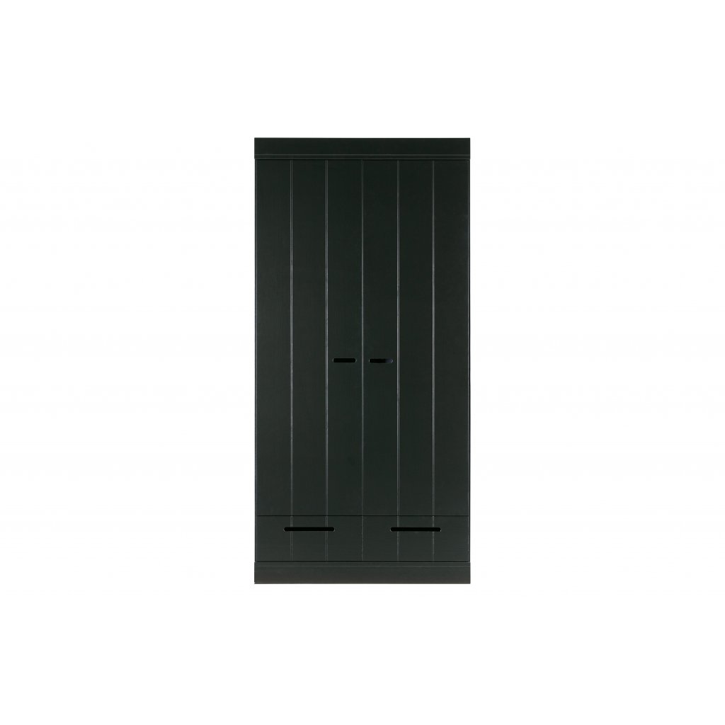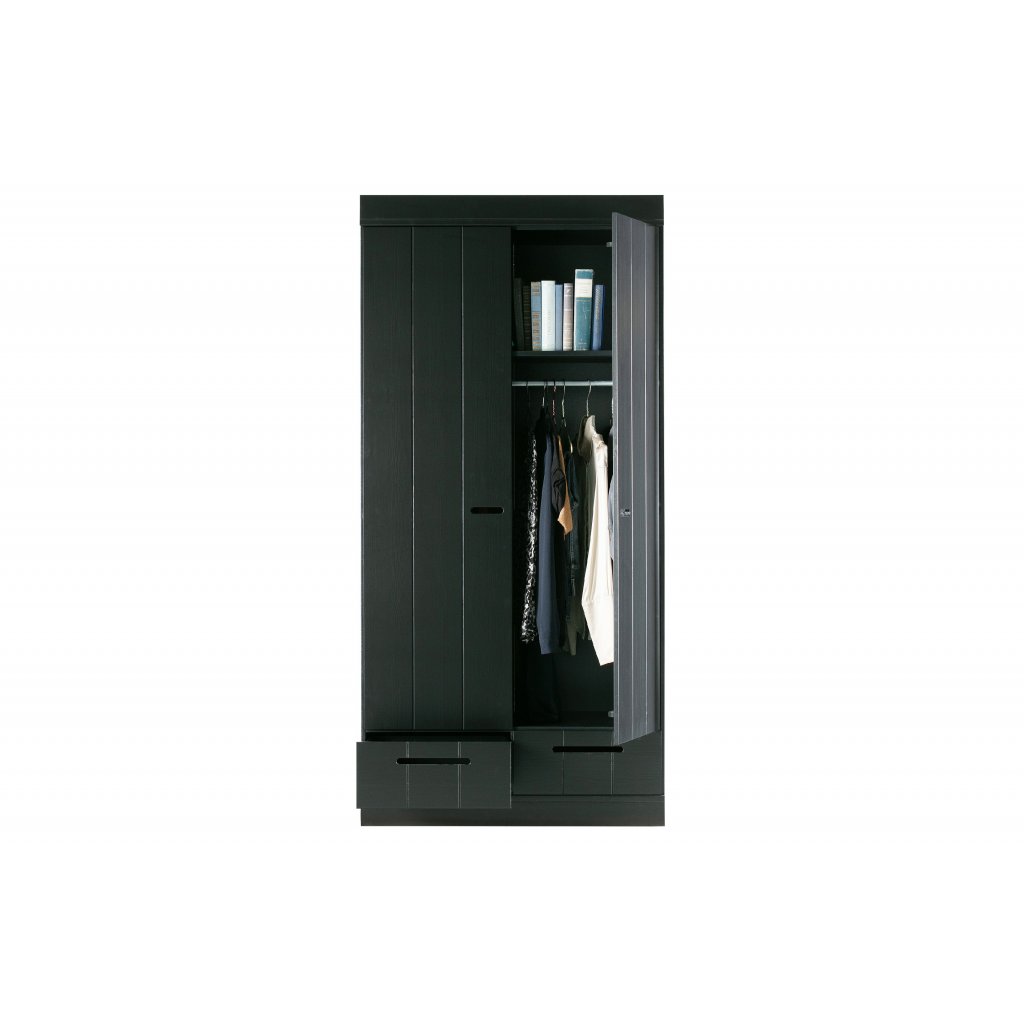 Designová šatní skříň ROW od holandského výrobce nábytku WOOOD. Skříň CONNECT tvoří konstrukce a boční desky z masivního dřeva borovice zajišťující skříni maximální stabilitu. Přední část představují 2 krásné dveře s jemnými rýhami, které svisle dělí jednotlivé dveře na tři části. Za nimi se skrývá úložný prostor rozdělený na jednotlivé police. Vnitřní přepážky jsou vyrobeny z dřevovláknité mdf desky se stejnou černou barvou. Skříň má navíc v dolní části dvě praktické zásuvky na drobné věci. Dřevo se pyšní certifikátem FSC, což značí ekologickou a k přírodě šetrnou těžbu dřeva a jde tak o ekologický výrobek.