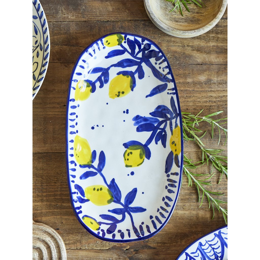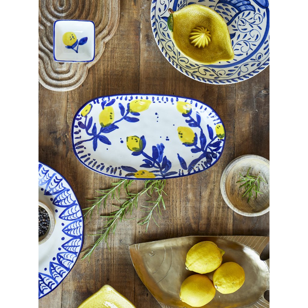 Stylový a krásný servírovací talíř MAXIMA od dánské značky nádherného nábytku BLOOMINGVILLE. MAXIMA je vyroben z kameniny a ručně zdoben krásným a barevným vzorem. Dekor talíře je inspirován teplými žlutými a modrými barvami středomoří a přináší na váš jídelní stůl svěží a příjemnou atmosféru. Tento talíř je ideální pro servírování svačin, hlavních chodů i slavnostní večeře.