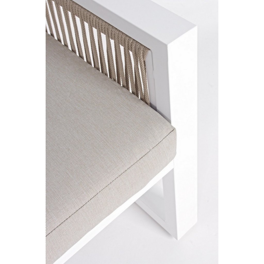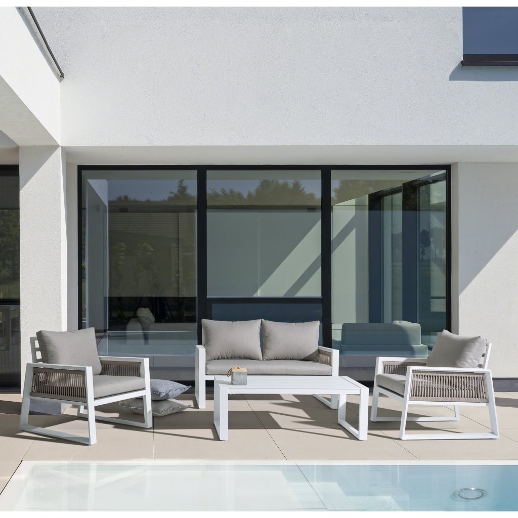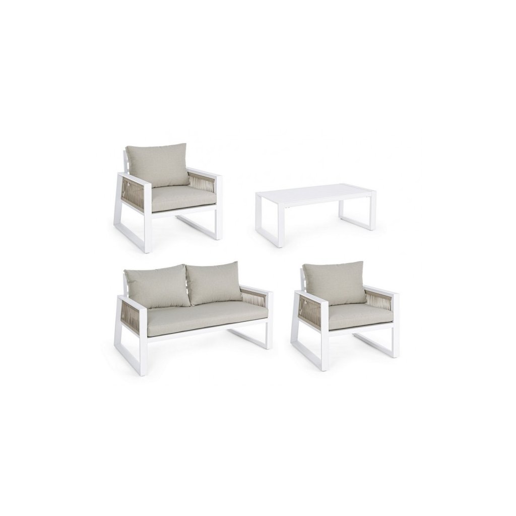 Designový zahradní set CAPTIVA od italského výrobce stylového nábytku BIZZOTTO. Zahradní sestavu tvoří dvoumístná pohovka a 2 křesla s kostrou z bíle lakovaného hliníku, která je pokryta odnímatelnými polštářky z béžového polyesteru a doplněna vrchními polštářky pro opírání. Na bočních stranách mají stylové kovové područky, v nichž jsou natažena krásná textilní lanka v béžové šedé barvě. Pohovku a křesla doplňuje konferenční stolek v provedení bílého kovu. Díky materiálu hliníku jsou odolné a lehké na manipulaci.