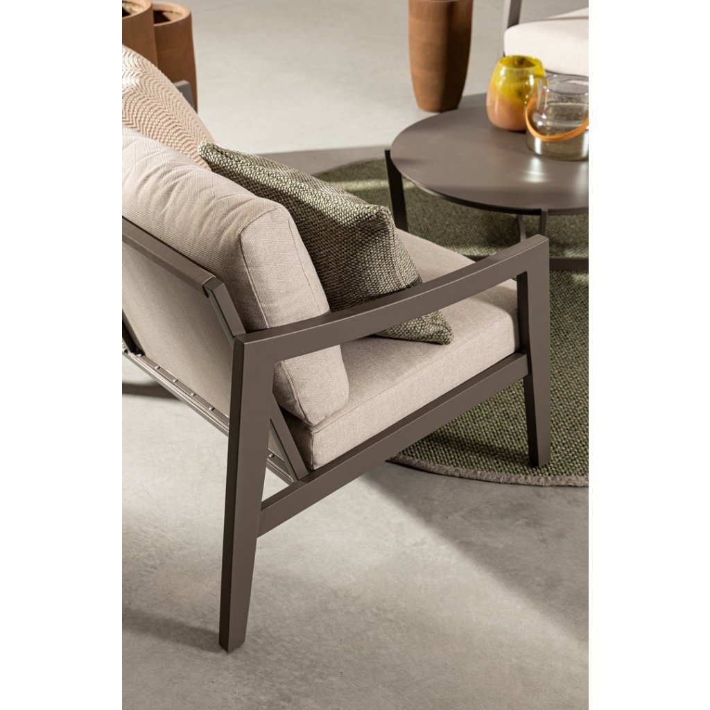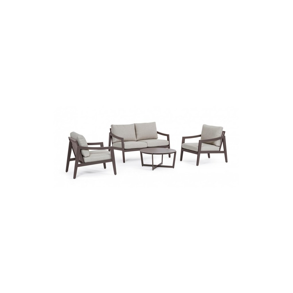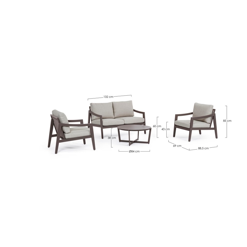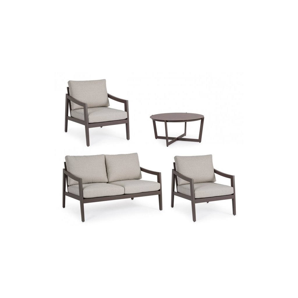 Designový zahradní set SIRENUS od italského výrobce stylového nábytku BIZZOTTO. Zahradní sestavu tvoří dvoumístná pohovka, 2 křesla a kulatý konferenční stolek. Celá sestava je vyrobena především z lehkého hliníku v hnědé barvě. Pohovka a křesla mají sedací a opěrné polštářky z béžového olefinu, který je odolný UV záření a vodě. Příjemné vám budou i boční područky u obou.  Díky materiálu hliníku jsou odolné a lehké na manipulaci.