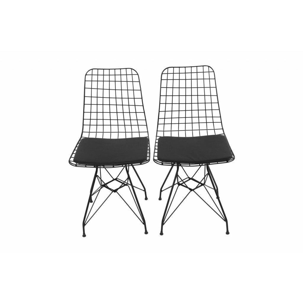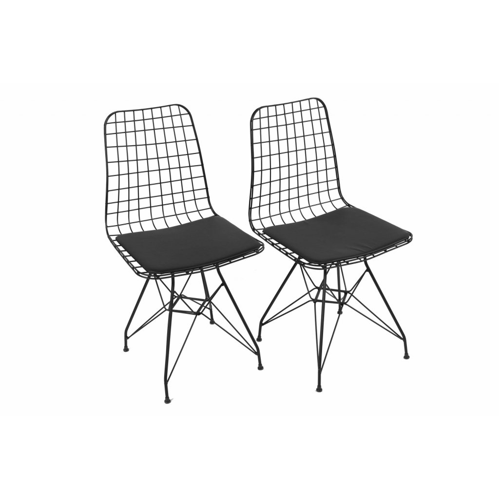 Set 2 kovových židlí MINDERLI od výrobce designového nábytku KALUNE DESIGN. Set tvoří 2 identické židle, jejichž hlavním materiálem je tenký černý kov. 4 nohy tvoří několik vzájemně propojených kovových tyčí, které zajišťují židlím maximální nosnost a stabilitu. Sedací část je taktéž z černého kovu ve tvaru navzájem napojených černých kovových tyčí do tvaru pletiva. Posadit se pak můžete na měkký sedák potažený umělou kůži v černé barvě.