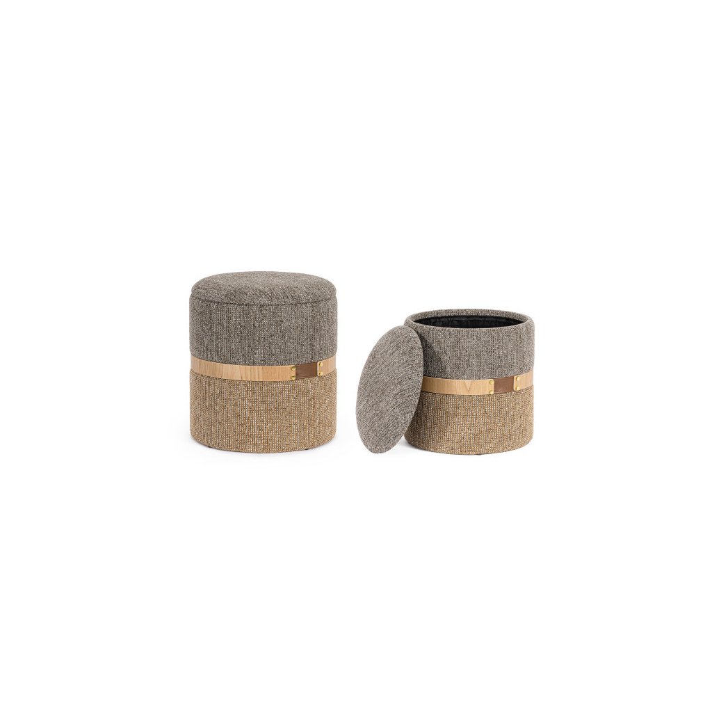Set 2 stylových taburetek TANYA od italského výrobce designového nábytku BIZZOTTO. Krásné 2 taburetky s vnitřním úložným prostorem a odejímatelným víkem jsou vyrobeny z dřevovláknité mdf desky a překližky, potaženy jsou polyesterovým potahem v šedé a béžové barvě, pro větší estetičnost jsou barvy odděleny dřevěným prstenecem. Estetická a praktická vychytávka do vašeho obývacího pokoje.