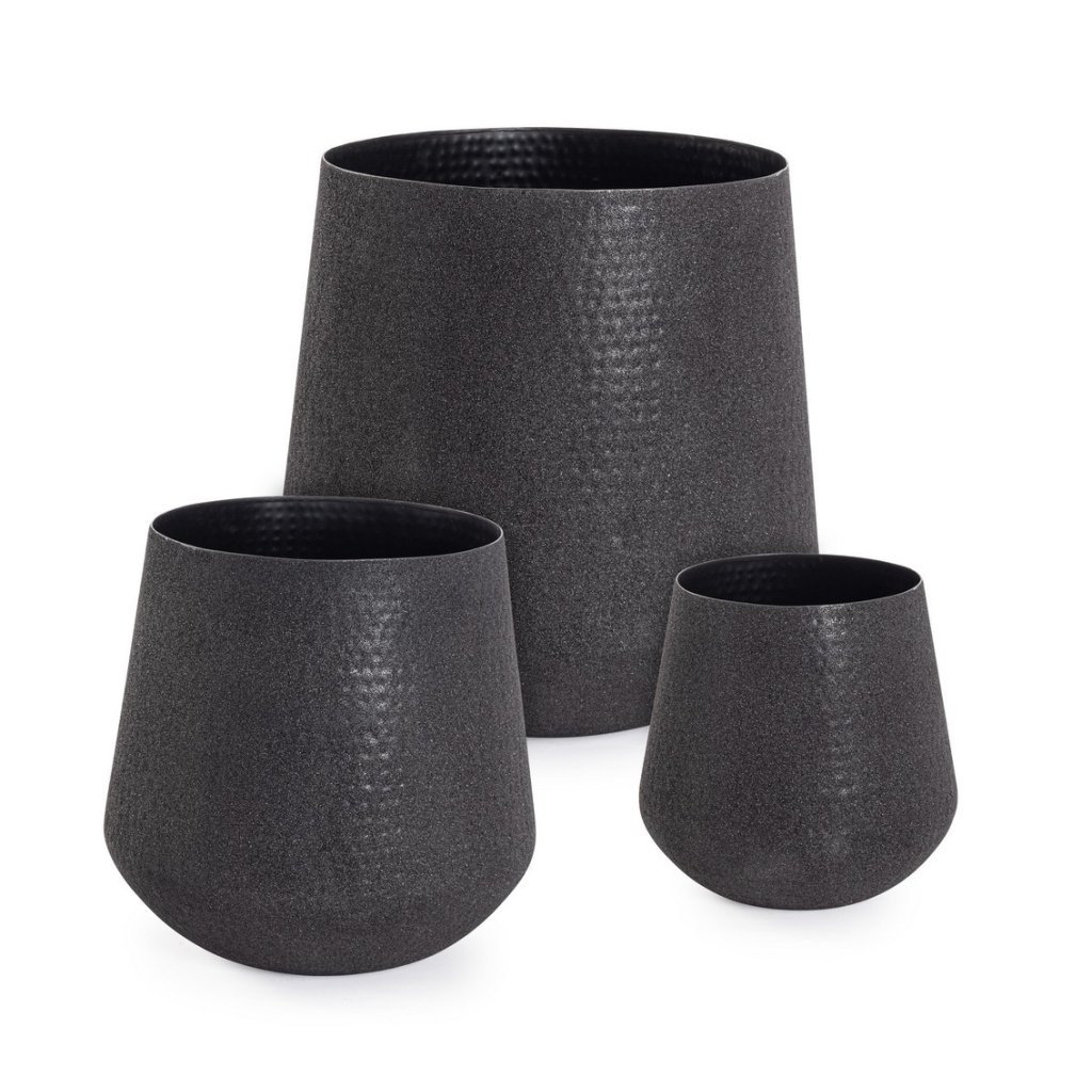 Set 3 květináčů KENAR od italského výrobce stylového nábytku BIZZOTTO z ručně opracovaného kovu s matnou smaltovou povrchovou úpravou v černém provedení.