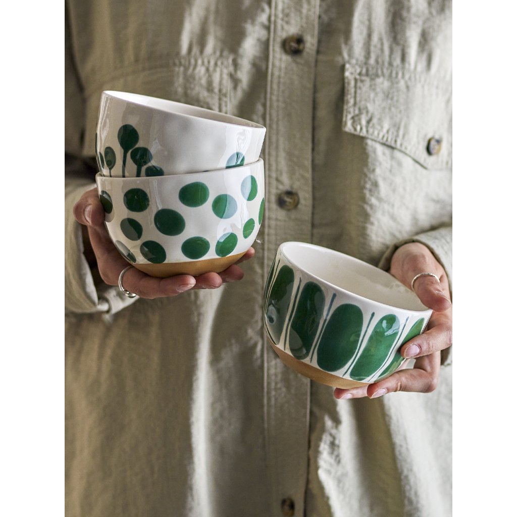 Stylový a krásný set 3 misek LINORA od dánské značky nádherného nábytku BLOOMINGVILLE. LINORA obsahuje 3 krásné kameninové misky, které mají jedinečný vzor v tmavě zelených tónech. Neglazované dno dodává miskám přírodní a rustikální vzhled a vytváří krásný kontrast s dekorativním designem. Misky jsou ideální pro servírování malých pokrmů, jako jsou svačinky nebo dezerty. Dobře fungují i jako dekorativní misky.