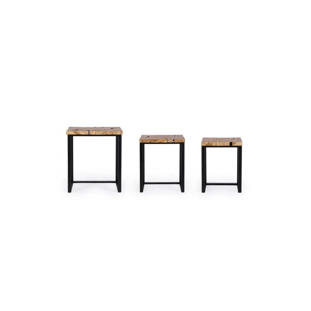 Designový set 3 odkládacích stolků ELWOOD od italského výrobce kvalitního nábytku BIZZOTTO. Stolky se skládají ze 4 kovových, černých nohou, které představují velkou pevnost a stabilitu, díky spodnímu propojení. Vrchní část stolků tvoří hranaté desky s odlišnými rozměry.  Desky jsou z různých kusů teakového dřeva a můžou se mírně lišit svou strukturou.