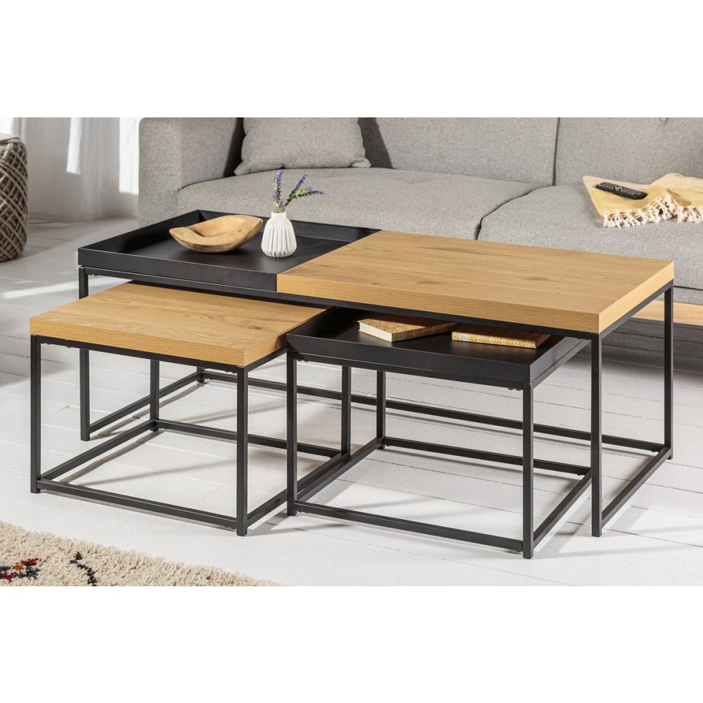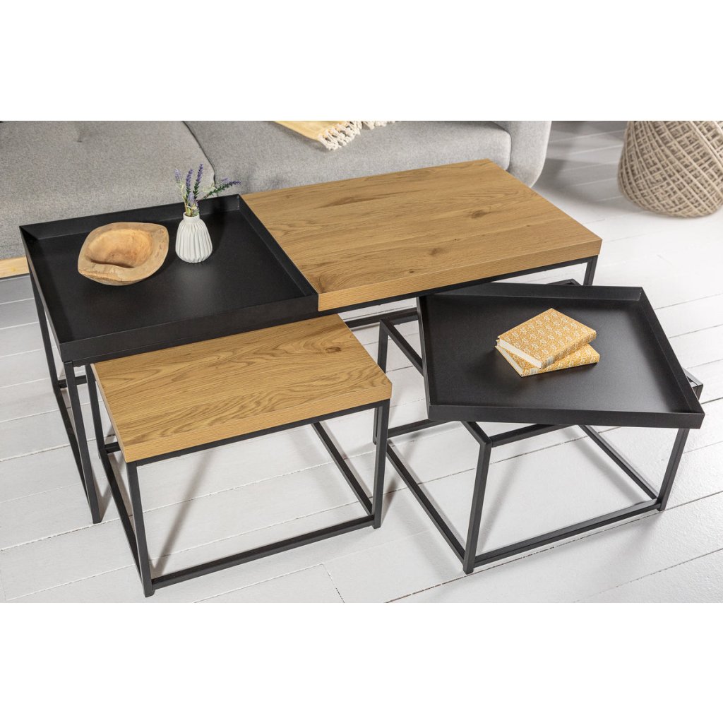 Designový set 3 stolků LOFT od německé značky designového nábytku INVICTA. Set je velmi zajímavý a vhodný, přináší hodně úložného prostoru a velkou variabilitu v jednotlivých komponentech. Kombinuje černý kov, mdf desku s dubovým vzhledem. Černé kovové tácy na stolcích jsou pak dokonce i odnímatelné. Lze mít vše rozděláno, když přijde návštěva, nebo naopak ukryto, pokud potřebuji prostor.