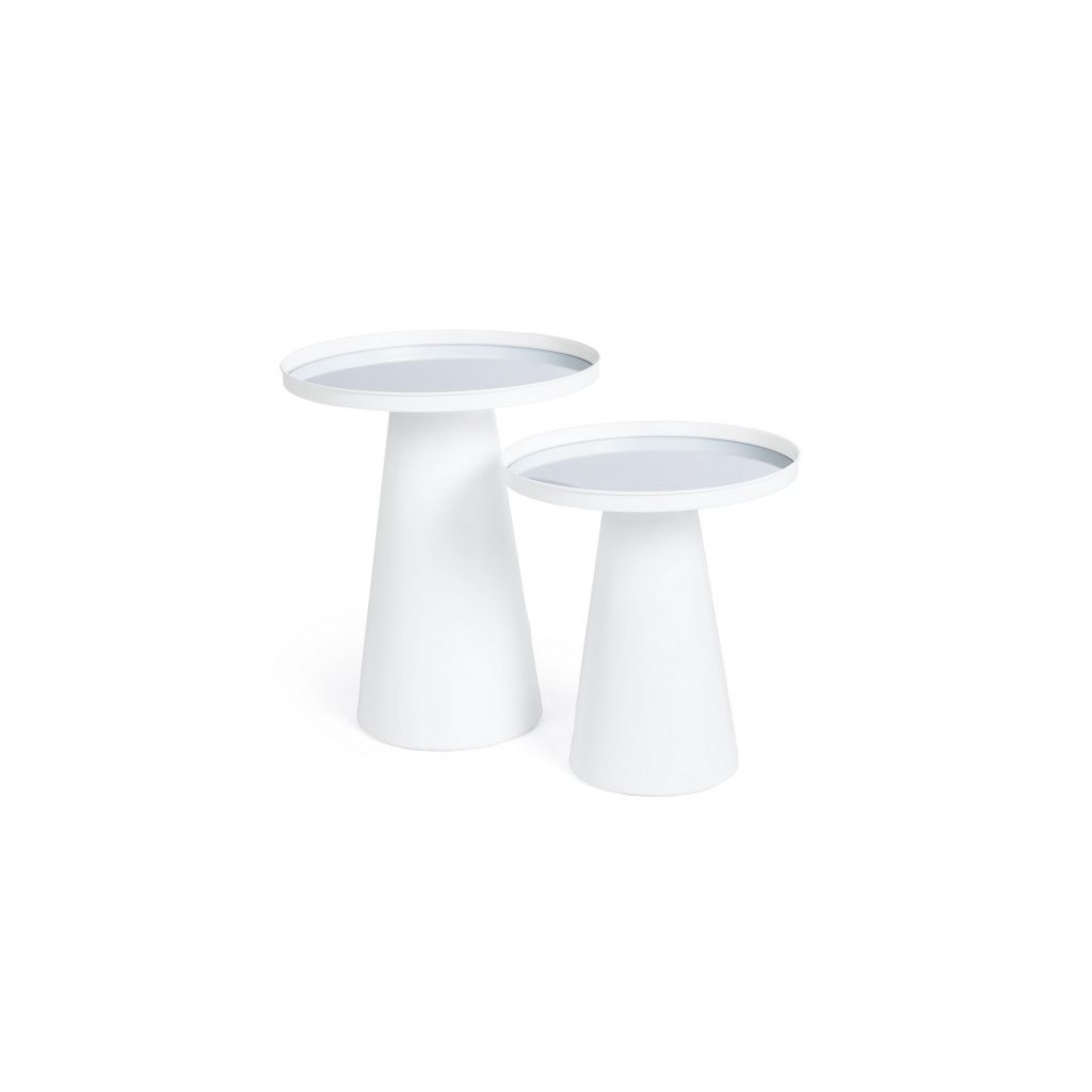 Designové konferenční stolky REFLEX od italské firmy stylového nábytku BIZZOTTO. Stolky REFLEX tvoří bílá ocelová konstrukce, která vás osloví svým zajímavým elegantním designem. Skleněná zrcadlová deska má kulatý tvar. Nádherné moderní konferenční stolky pozvednou úroveň každého obývacího pokoje. Stolky se prodávají v setu po 2 kusech.