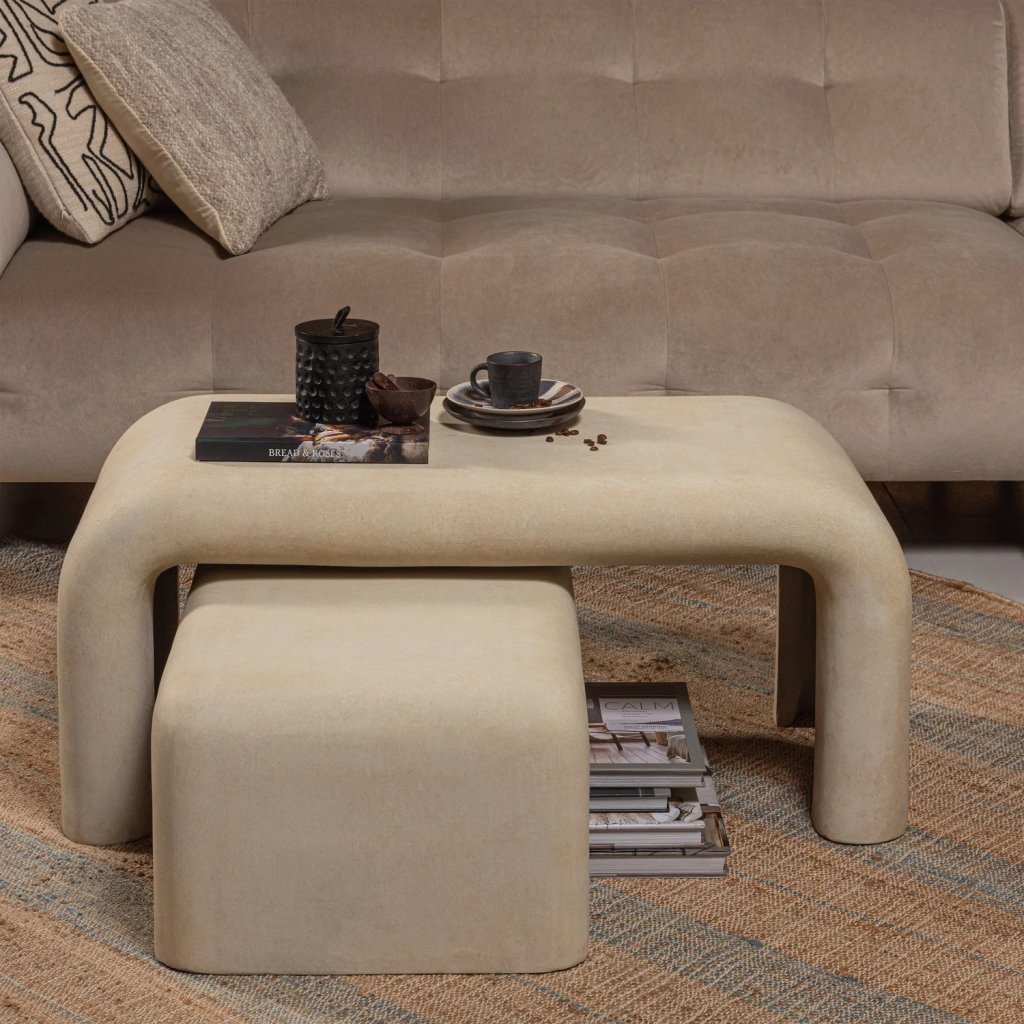Set dvou konferenčních stolků STANI od holandského výrobce designového nábytku WOOOD. Sada dvou organických konferenčních stolků je vyrobena z lehkého vláknitého jílu ve světlém provedení. Vláknitý jíl má betonový vzhled, ale je pozoruhodně lehký. Přírodní povrch vytváří klidný vzhled, díky čemuž se stoly dobře hodí do japonského nebo severského stylu bydlení.