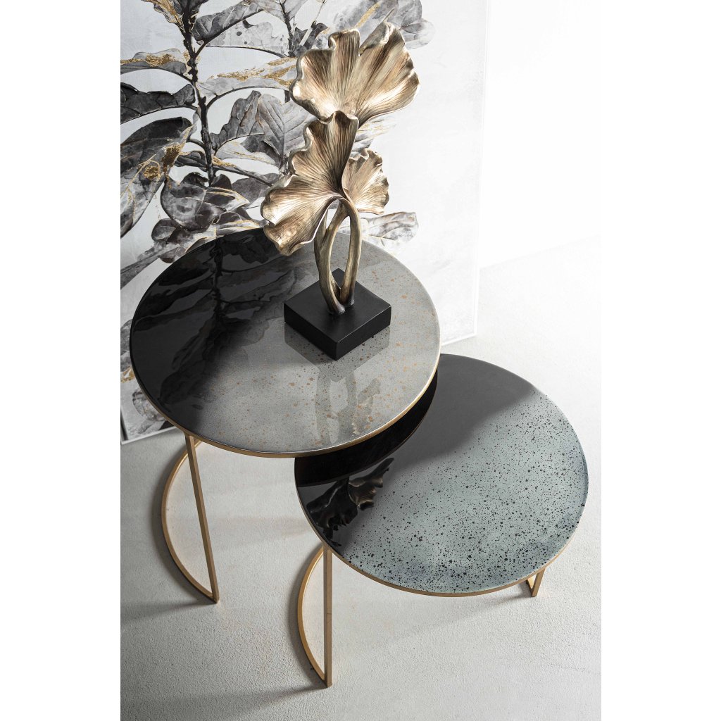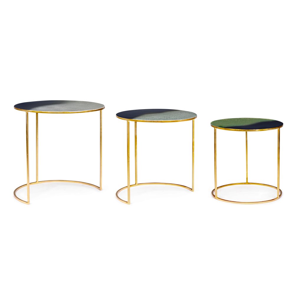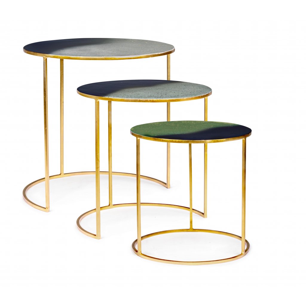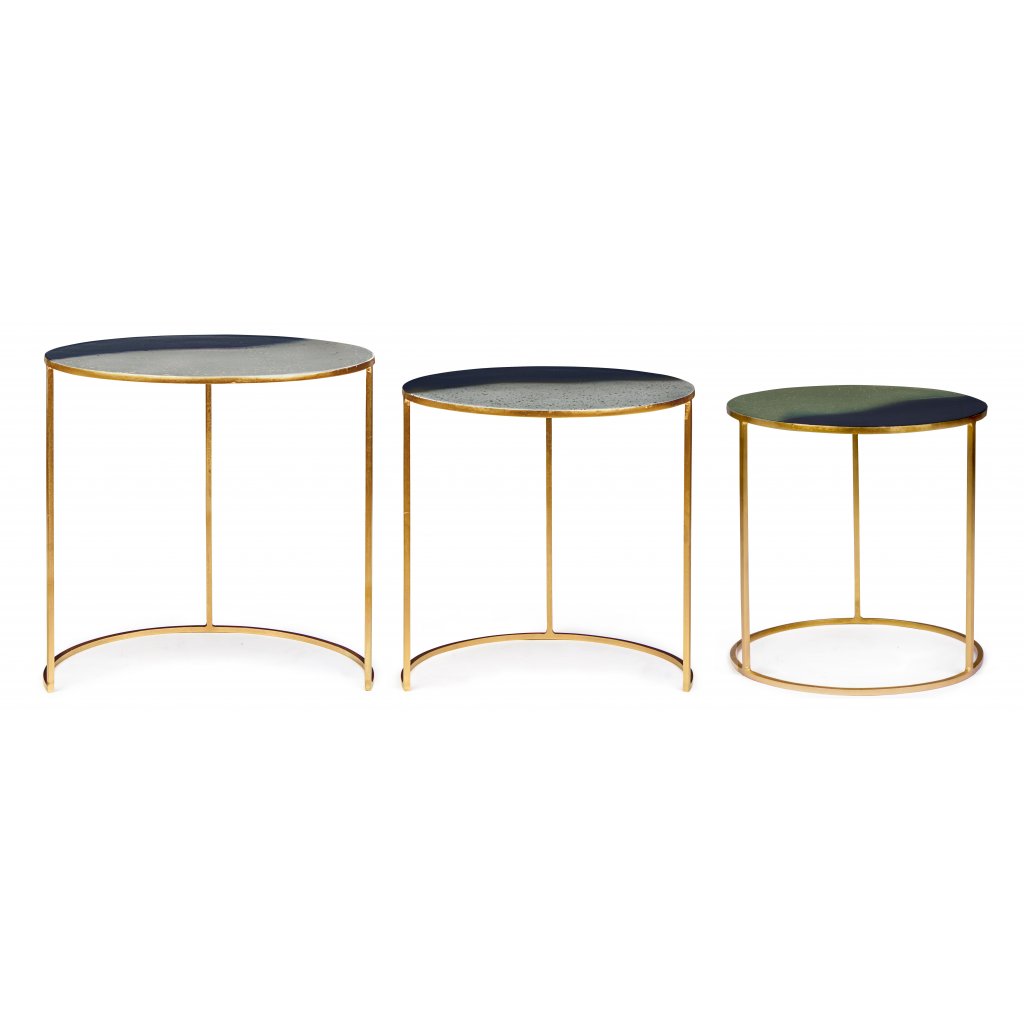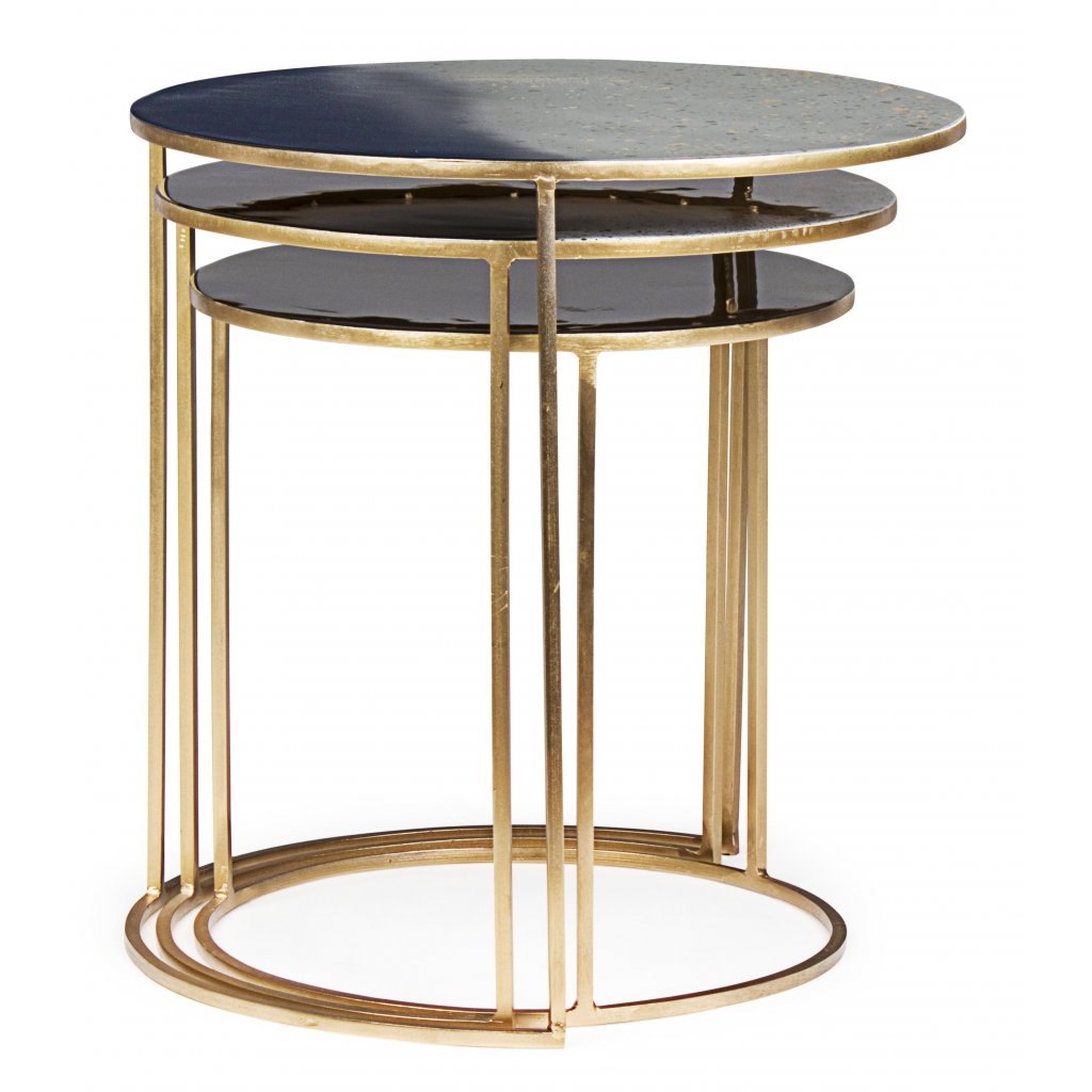 Set tří designových stolků DESUR od italské firmy stylového nábytku BIZZOTTO je vyroben z oceli se zlatým dekorem a smaltovanou vrchní úpravou desky.