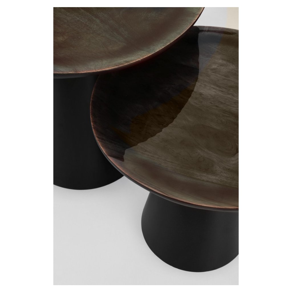 Designové konferenční stolky ZAINAB od italské firmy stylového nábytku BIZZOTTO. Stolky ZAINAB tvoří kulatá deska z mangového dřeva a kuželovitá základna z oceli s epoxidovým práškovým nátěrem. Každý má jiné rozměry desky a výšku, čímž vzniká velmi elegantní a krásný set, který můžete kdykoliv rozdělit a používat separátně.