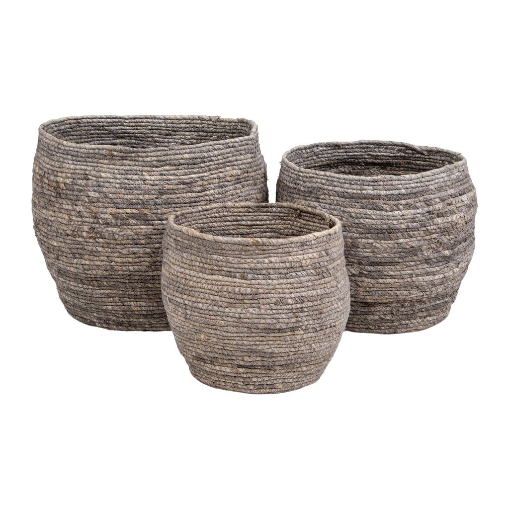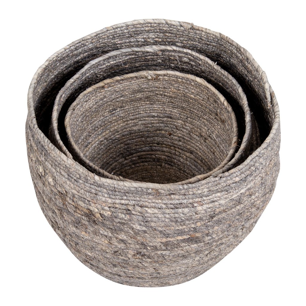 Designový set 3 odkládacích košů TIVOLI od dánské značky nádherného nábytku HOUSE NORDIC. Koše jsou vyrobeny z vláken sušených listů kukuřice, které jsou zpracovány jako jednotlivé provazy. Každý z jednotlivých košů má jinou velikost a průměr, díky čemuž lze tyto košíky vložit postupně do sebe a uklidit, aniž by zabíralo hodně místa.