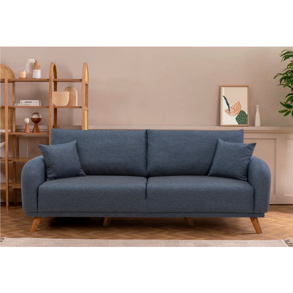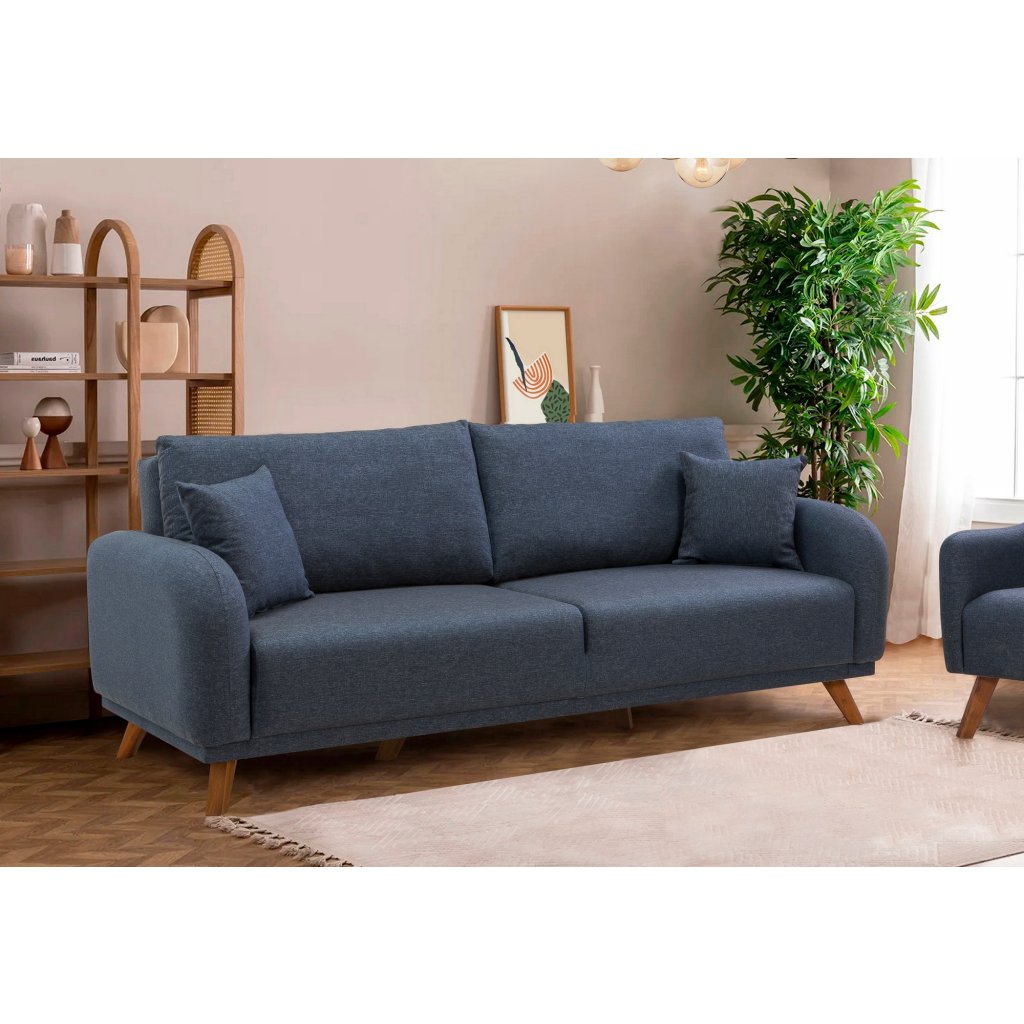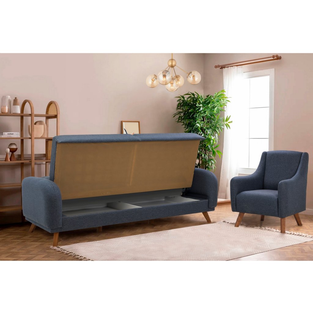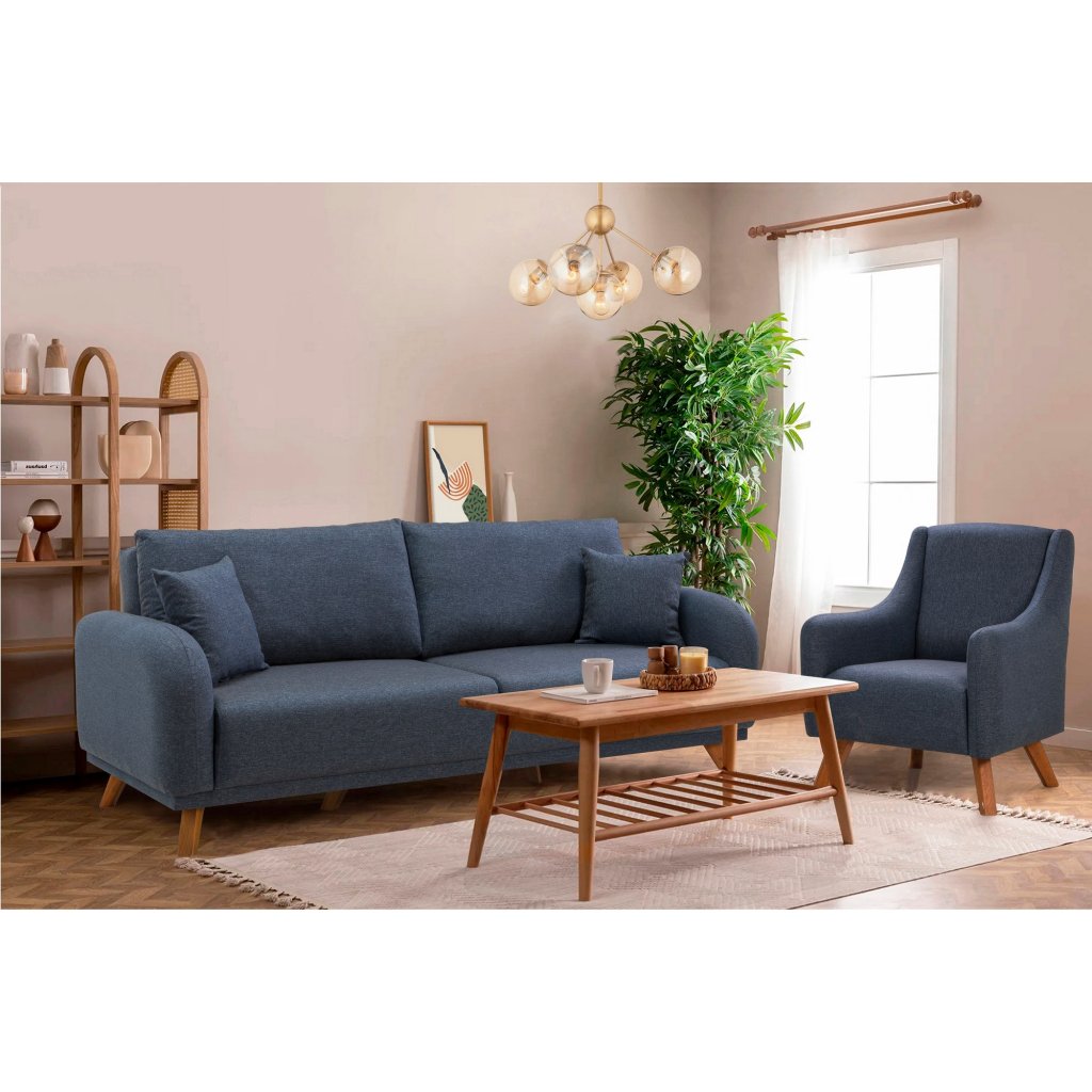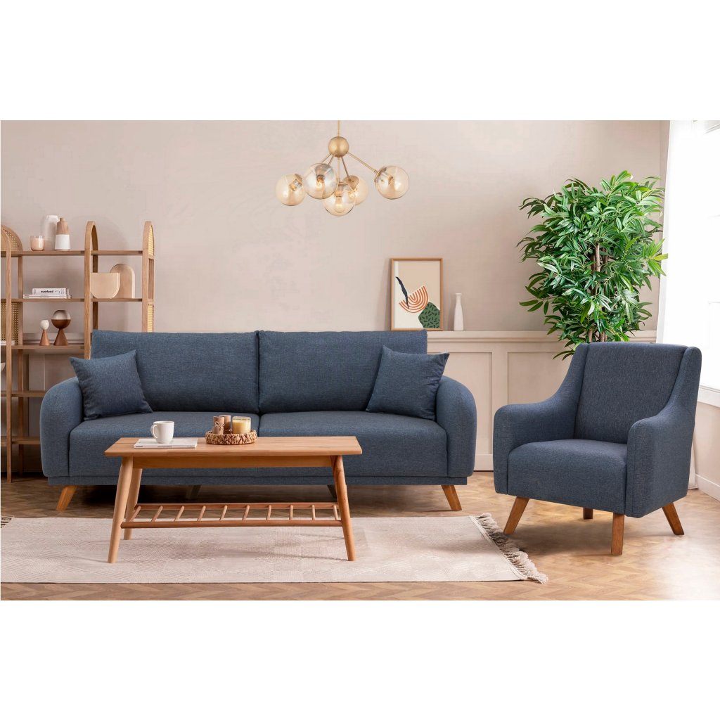 Designový set třímístné pohovky s křeslem HERA od výrobce nábytku a pohovek Hanah Home. Pohovka s křeslem HERA vás zaručeně zaujmou na první pohled. Velice stylová pohovka vás osloví nejen kvalitním zpracováním, ale také svým minimalistickým designem. Rám pohovky i křesla je kompletně vyroben z bukového dřeva. Krásná tmavě modrá látka je ze 100% lnu. Sedák je vyplněn pěnou. Pohovka s křeslem budou skvělým místem pro odpočinek a relaxaci. Pohovka je velmi praktická díky úložnému prostoru a možnosti rozložení.