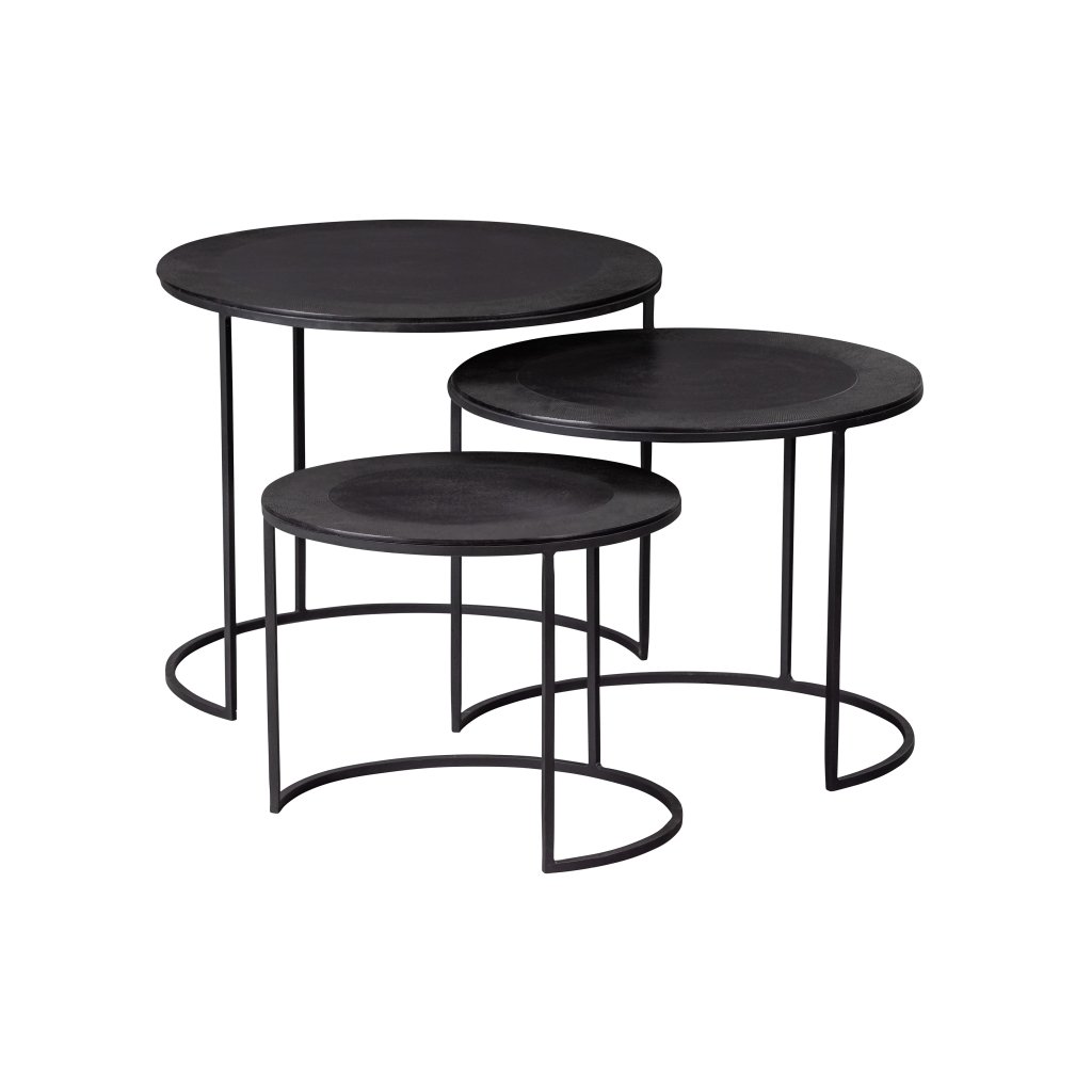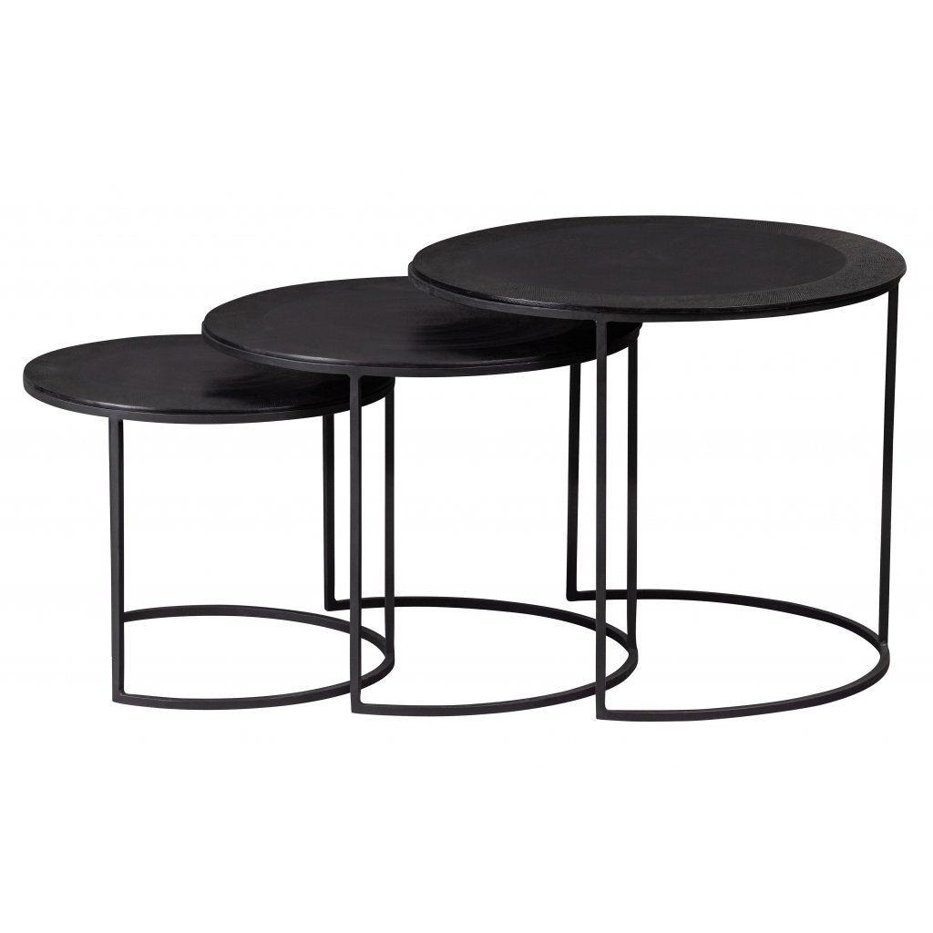 Set tří odkládacích stolků JANNA od holandského výrobce kvalitního nábytku WOOOD. Tenký kovový rám má tři různé výšky a jsou vyrobeny tak, aby se daly snadno zasunout pod sebe. Desky kulatého stolu mají tmavě hnědou povrchovou úpravu, a proto přinesou do vašeho domova hřejivou atmosféru. Desky stolu mají tloušťku 0,5 cm.