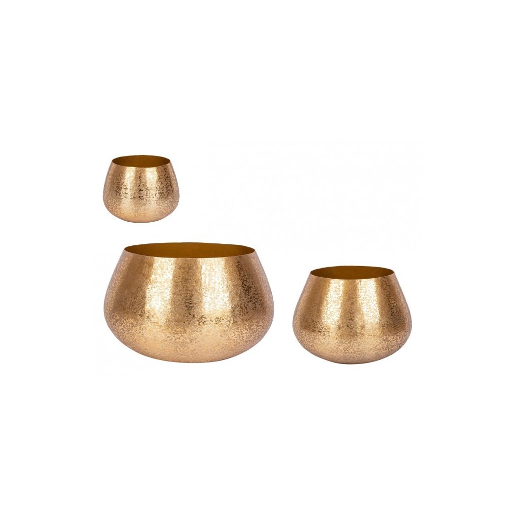 Set 3 zlatých květináčů VARANASI od italské značky stylového nábytku BIZZOTTO v provedení zlatého kovu.