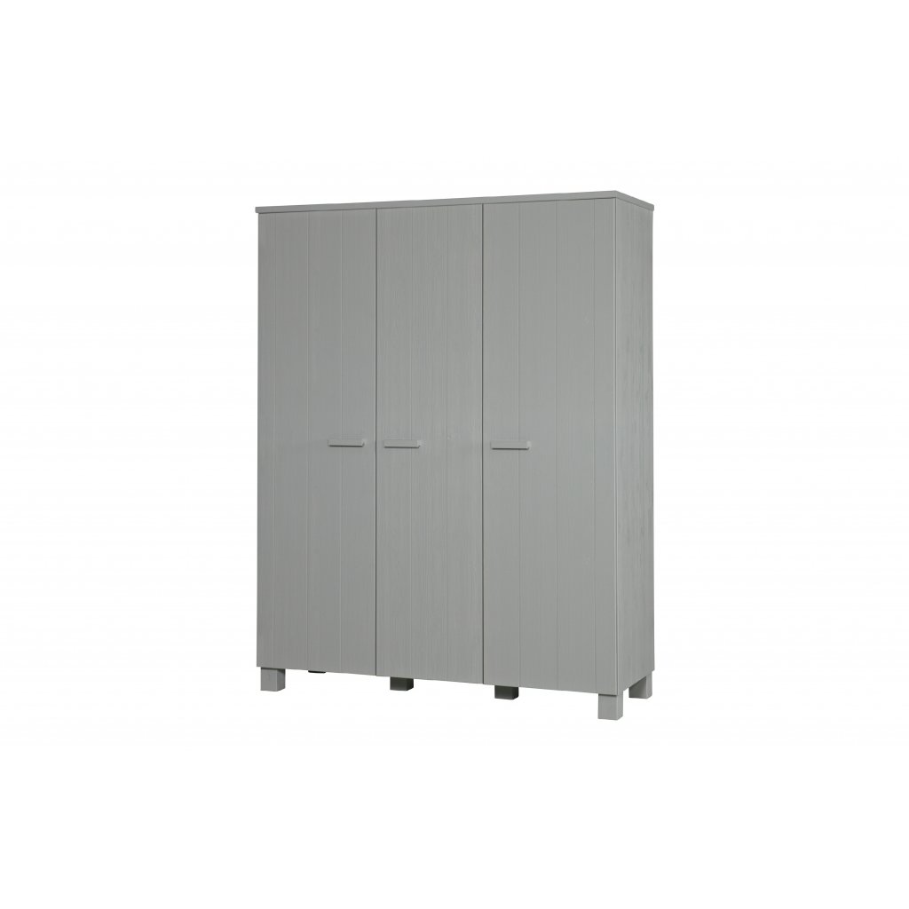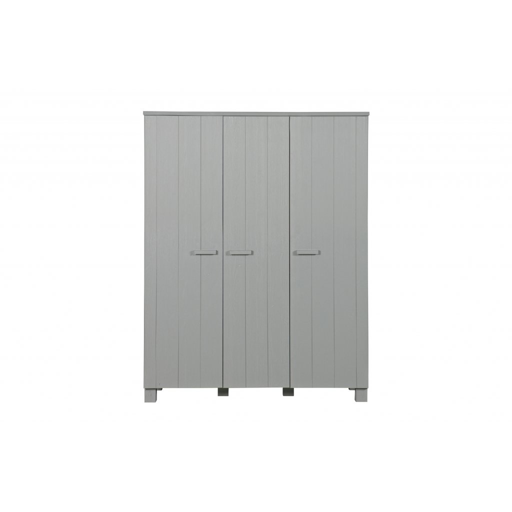 Stylová skříň DENNIS od holandského výrobce nábytku WOOOD. DENNIS tvoří konstrukci a boční desky ze světle šedého masivního dřeva borovice zajišťující skříni maximální robustnost a stabilitu. Přední část představují 3 do strany otevíratelné dveře s jemnými rýhami a krásnými šedými madly. Za nimi se skrývá úložný prostor rozdělený na levou část pro pověšení košil, trik a dalších, pravou část pro uložení poskládaných věcí a oblečení. Vnitřní přepážky jsou vyrobeny z šedého malaminu a vnitřní použité broušené borovicové dřevo bylo vyrobeno ekologicky a pyšní se certifikátem FSC.