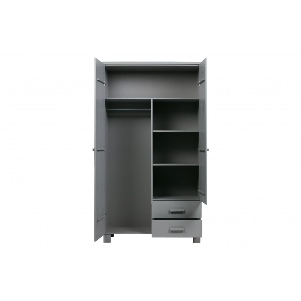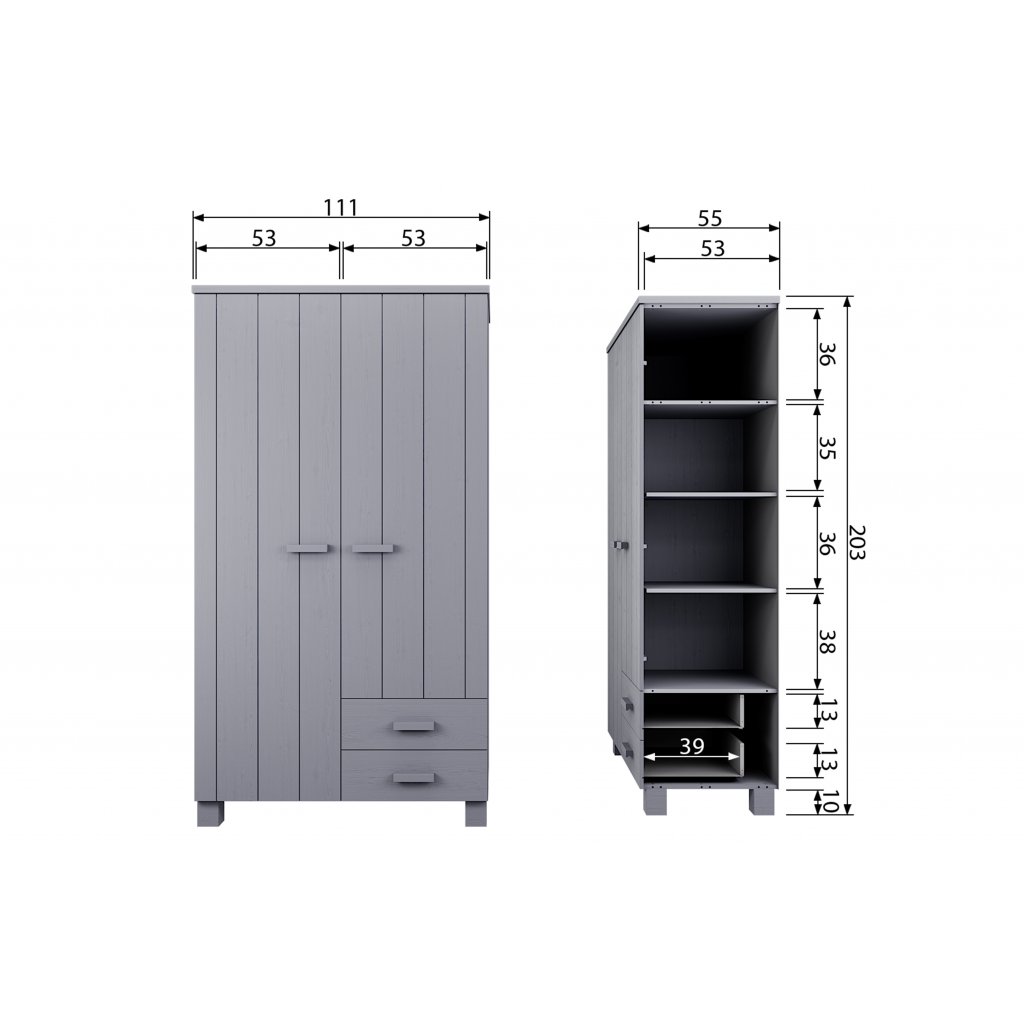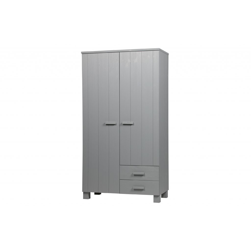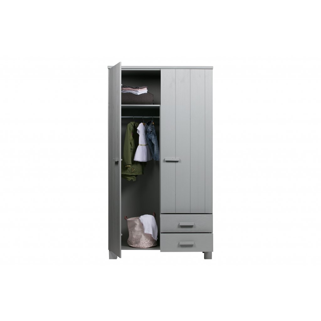 Stylová skříň DENNIS od holandského výrobce nábytku WOOOD. DENNIS tvoří konstrukci a boční desky ze světle šedého masivního dřeva borovice zajišťující skříni maximální robustnost a stabilitu. Přední část představují 2 rozdílně veliké dveře s jemnými rýhami a krásnými šedými madly. Za nimi se skrývá úložný prostor rozdělený na větší část pro zavěšení košil, triček nebo šatů, vrchní větší polici pro uložení větší věcí a 3 police pro úschovu poskládaných kusů oblečení. Na pravé straně jsou 2 výsuvné zásuvky, které nejsou ukryty dveřmi a jsou volně přístupné. Vnitřní přepážky jsou vyrobeny z šedého malaminu a vnitřní použité broušené borovicové dřevo bylo vyrobeno ekologicky a pyšní se certifikátem FSC.
