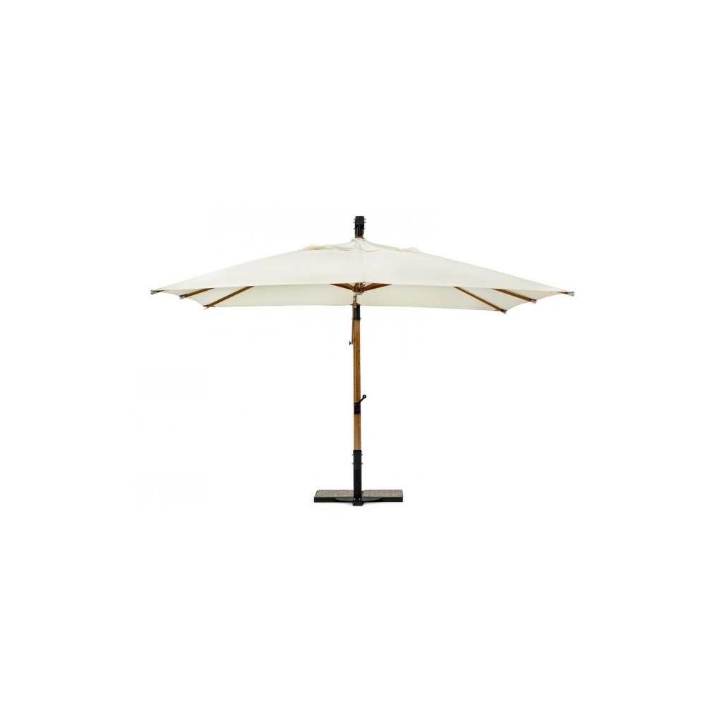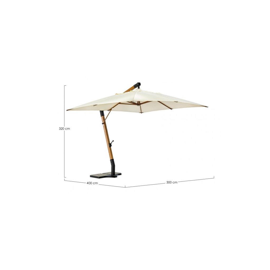 Designový slunečník od italské firmy BIZZOTTO. Robustní dřevěný rám v teakové barvě má skvělou stabilitu. Béžová plachta s větracím otvorem u špičky je natažena na 8 žebrech - 20x35 milimetrů. Díky jejich hliníkovým koncům a koženým vložkám bude potah vždy na svém místě. Spoje dřevěné konstrukce jsou z oceli. Slunečník se dá nastavit dle libosti je otočný o 180°. Ocelová základna pro umístění cementových bloků. Bloky nejsou součástí balení.