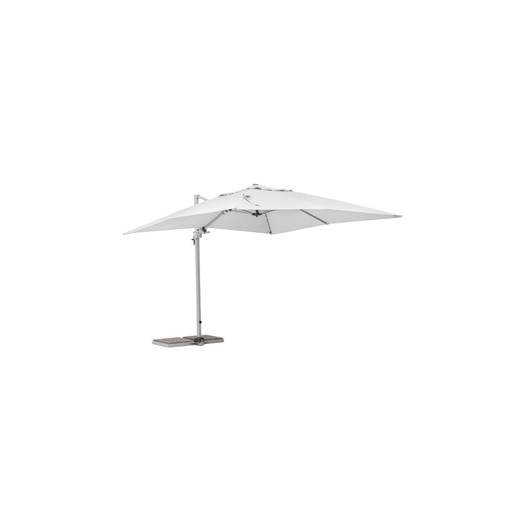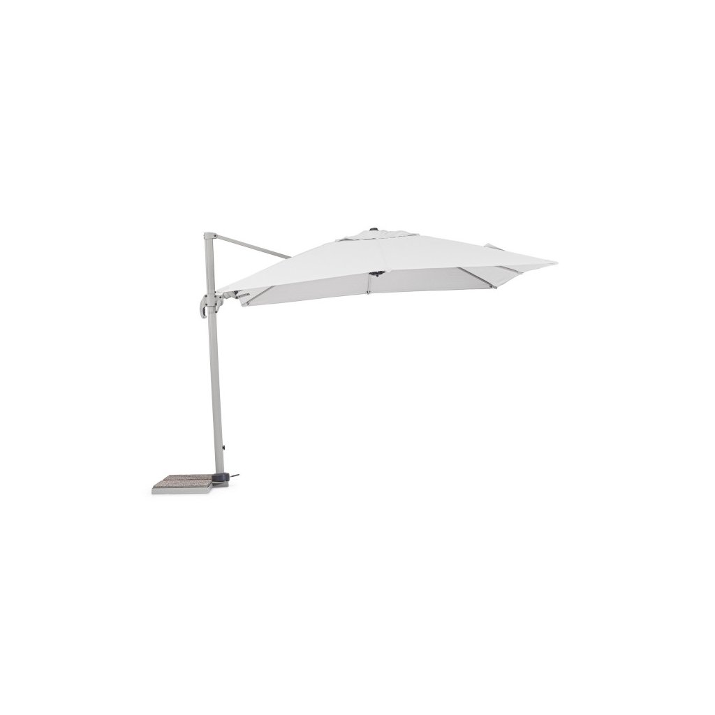 Designový velkoformátový slunečník SARAGOZZA s boční nohou od italského výrobce BIZZOTTO. Konstrukce je vyrobena z pevného hliníku s kvalitním práškovým nástřikem na bázi polyesteru. Bytelná hlavní tyč nese stříšku podepřenou 8 lamelami. Plachta je vyrobena ze šedého polyesteru vysoké gramáže (250 g/m²) a je opatřena polyamidovým (PA) potahem. Nechybí ani praktický větrací průduch (komínek), který brání podfouknutí větrem. Slunečník vyniká svou extrémní variabilitou – díky pedálu na základně jej můžete snadno otáčet o celých 360°, pomocí madla vertikálně naklápět až do 5 různých poloh a další madlo umožňuje naklápění plachty zleva doprava. Slunečník je navíc konfigurovatelný pro instalaci LED osvětlení a reproduktoru. Součástí balení je ocelová boční základna a ochranný obal na slunečník. Betonové zatěžovací dlaždice nejsou součástí balení.