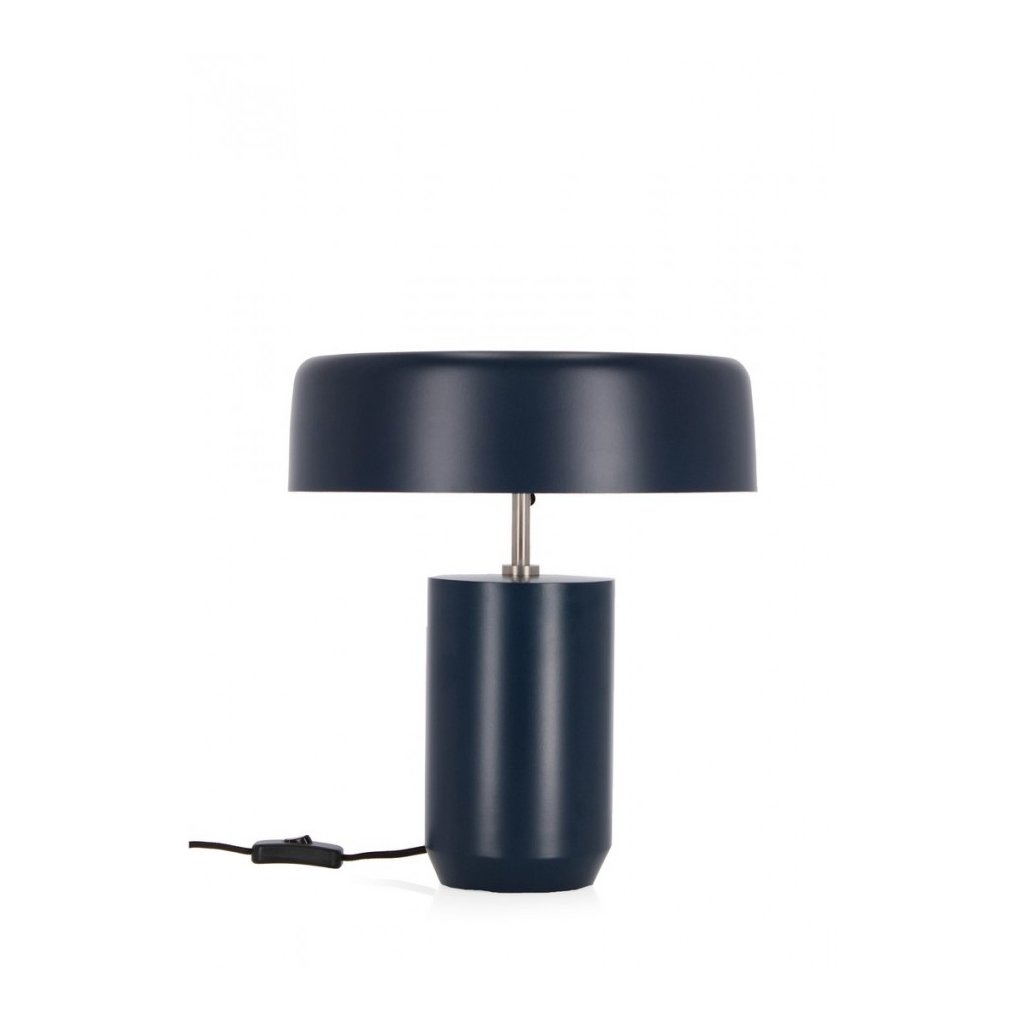 Designová stolní lampa KAITHAL od italského výrobce stylového nábytku BIZZOTTO . Lampa je vyrobena z tmavě modrého práškovaného kovu, tvoří ji široká kulatá podstava a  hlava lampy ve tvaru hranaté mísy, na kterou je napojena zlatá tyč. Díky své barvě se skvěle hodí jak do světlých, tak tmavých interiérů.