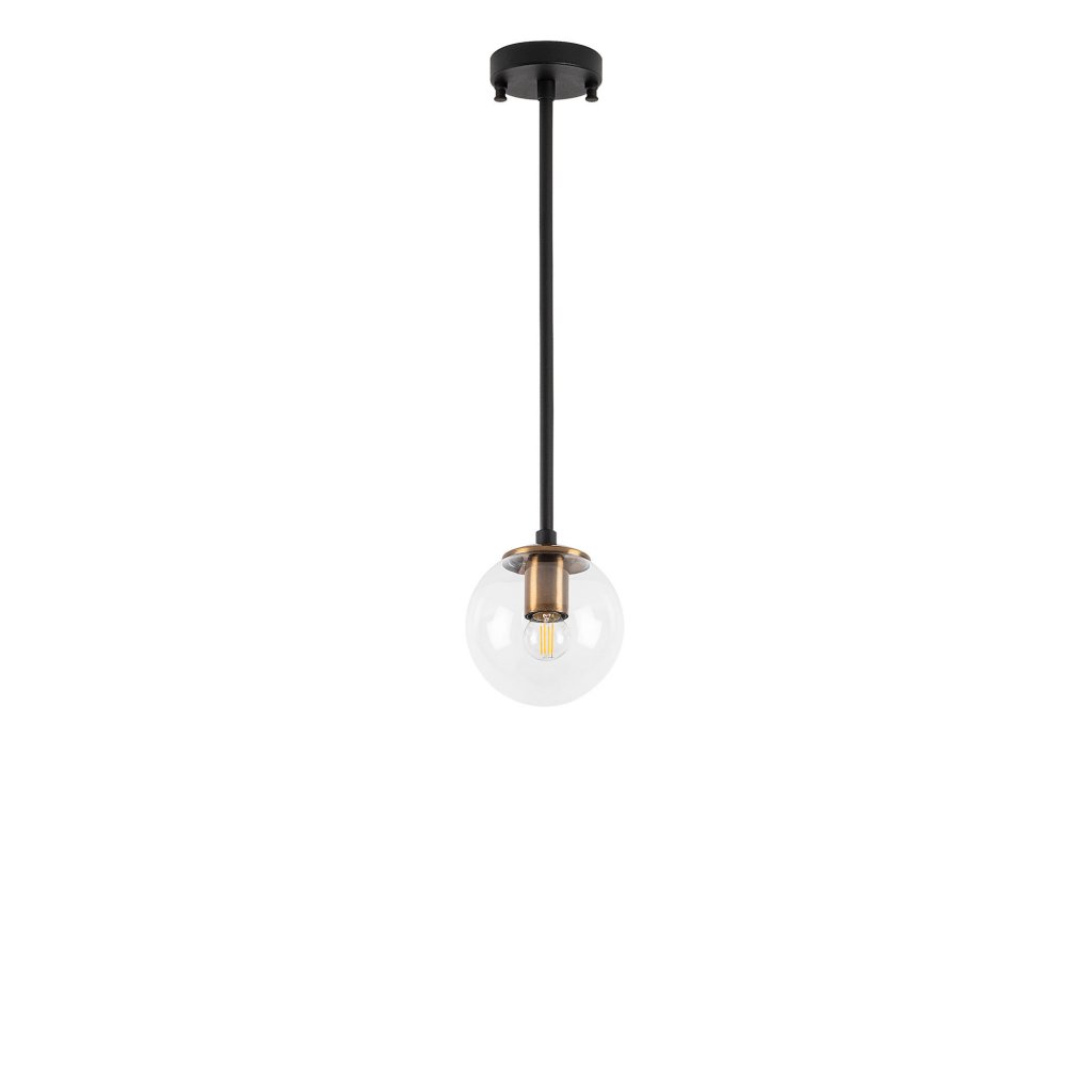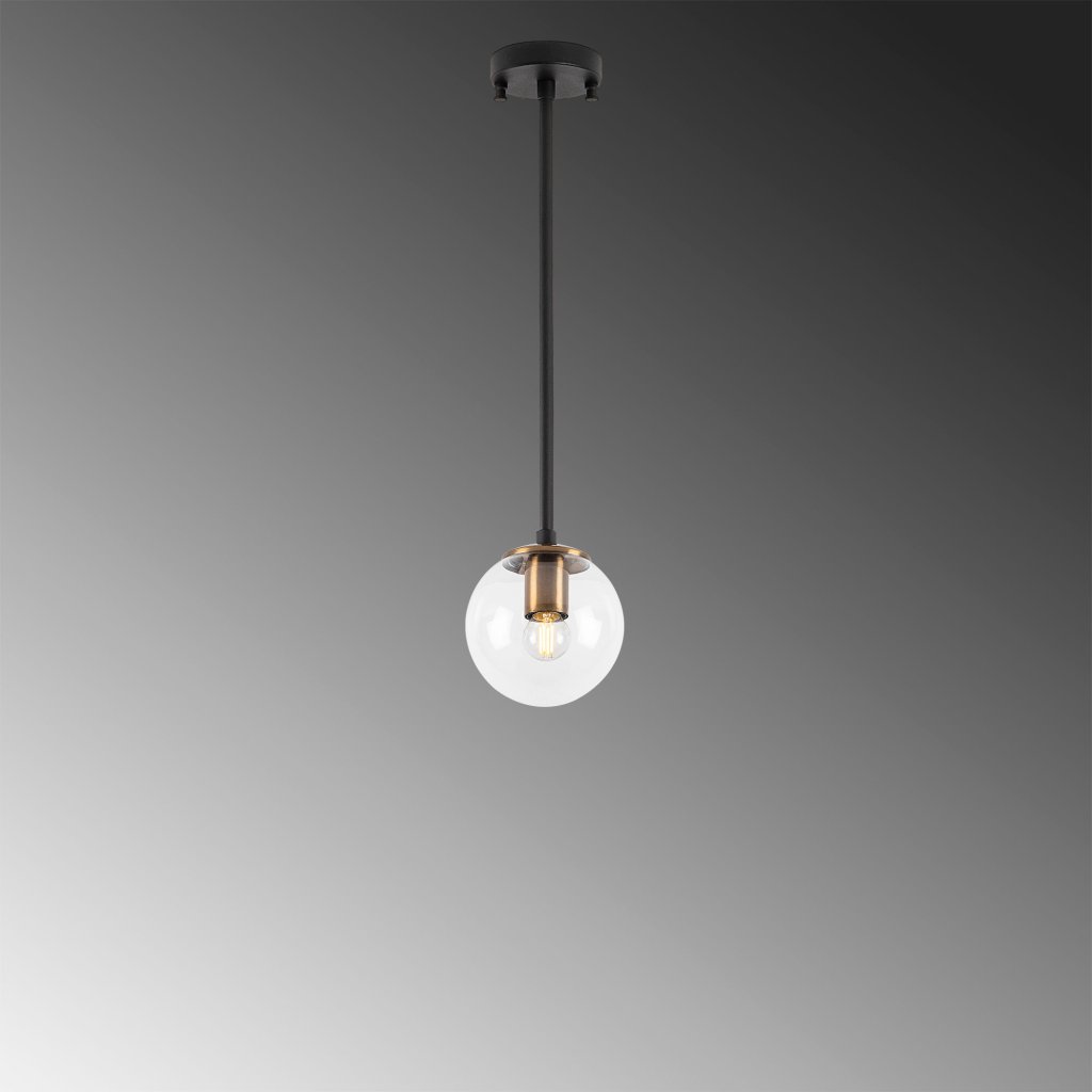Designové závěsné světlo AKKAS od výrobce stylového osvětlení OPVIQ. Světlo tvoří vrchní kovová černá krytka s poloměrem 15cm a 2 kryty šroubů pro uchycení. Následně přechází v černou kovovou tyč, která je zakončena zlatou objímkou pro žárovku. Ta je obklopena koulí z průhledného skla s poloměrem 15cm. Velmi nádherné a stylové světlo.
