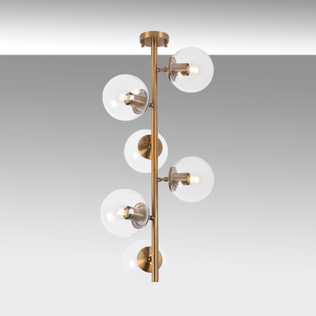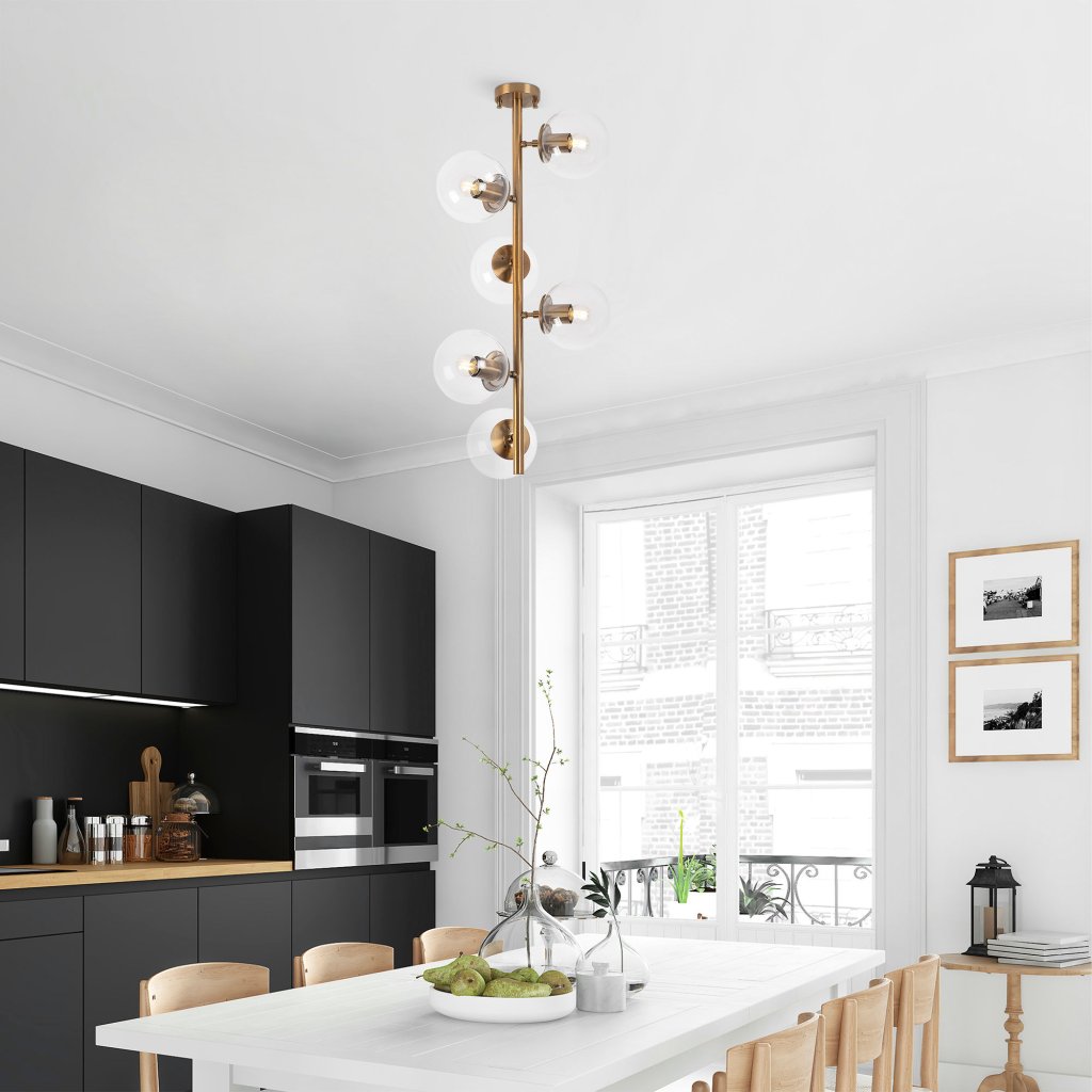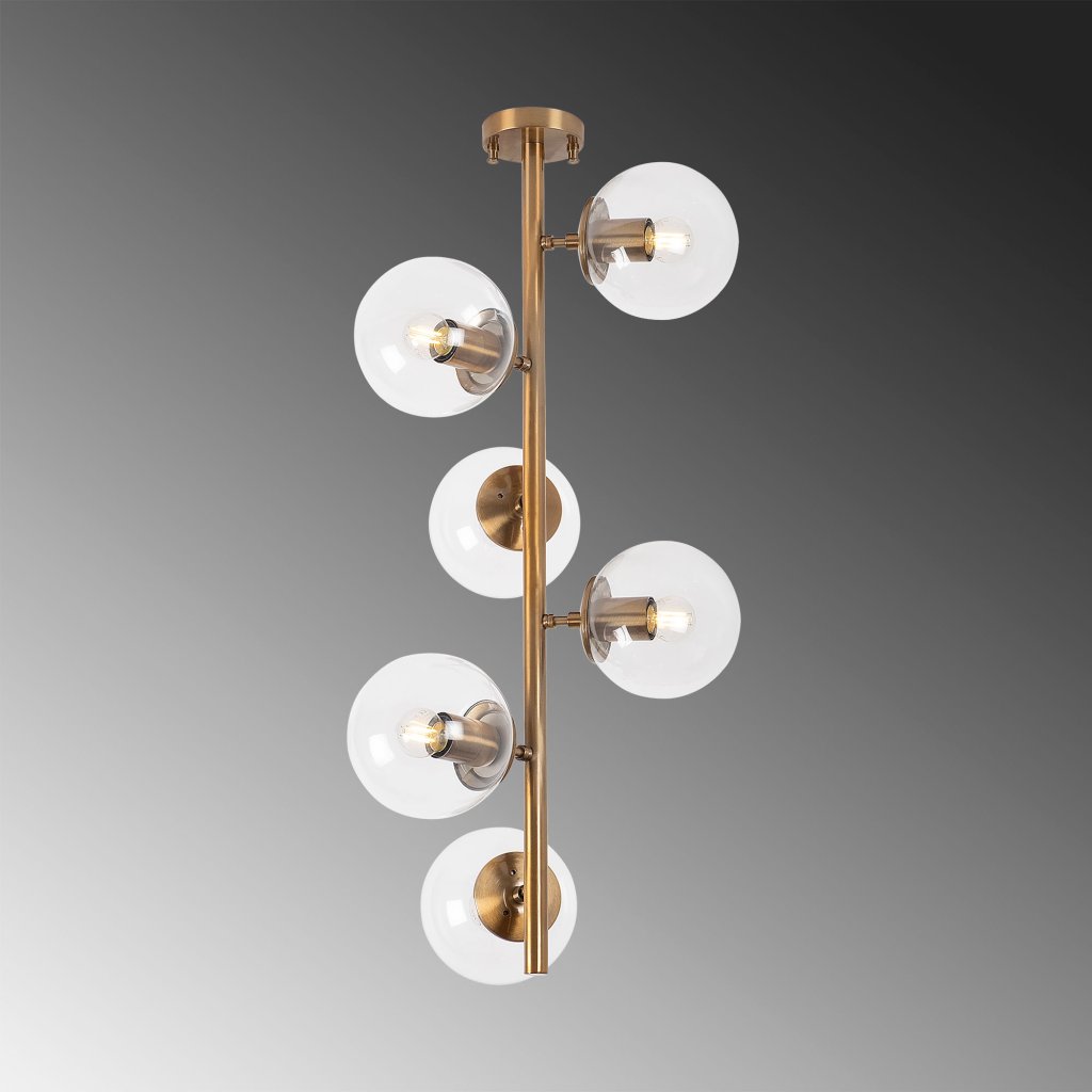 Stylové závěsné světlo FAZLI od výrobce designových světel OPVIQ. FAZLI tvoří vrchní kovová mosazná krytka pro zakrytí kabelů a uchycení do stropu, ze které vychází černá bronzová podlouhlá tyč, ze které vychází 6 bronzových objímek a nádherná stínidla z čirého skla. Vzájemně vytváří velmi nádherné osvětlení, které vám bude kdekdo závidět.