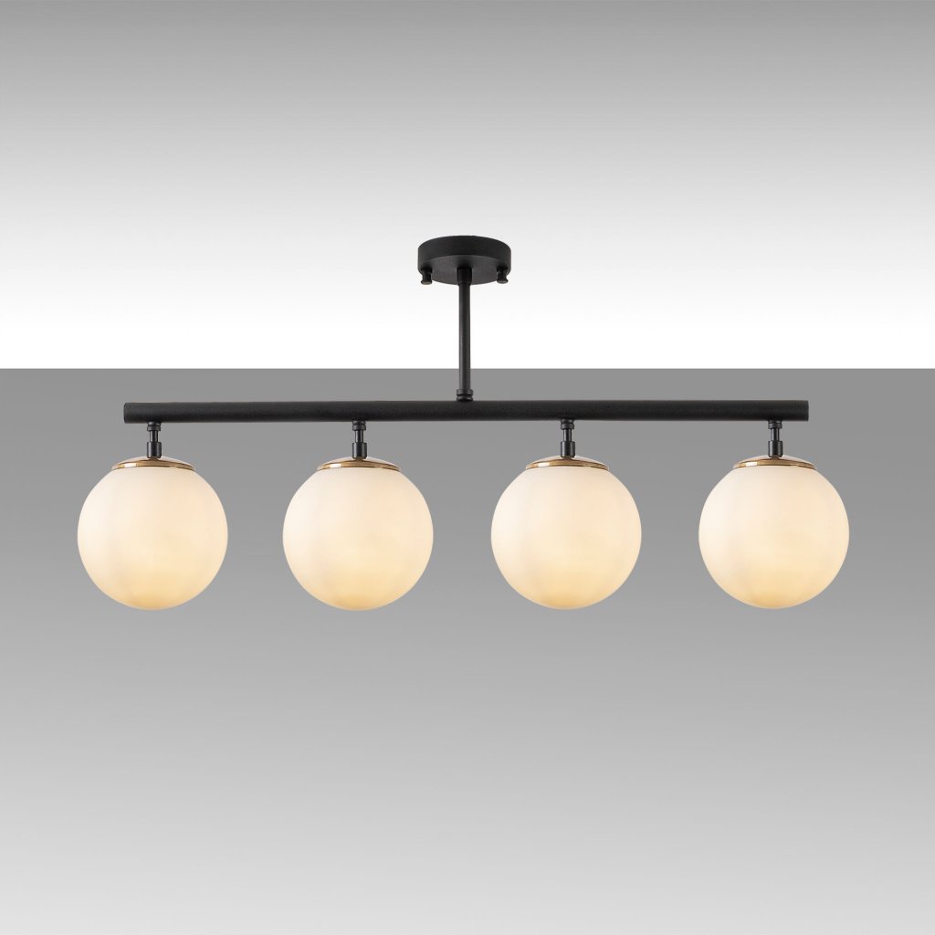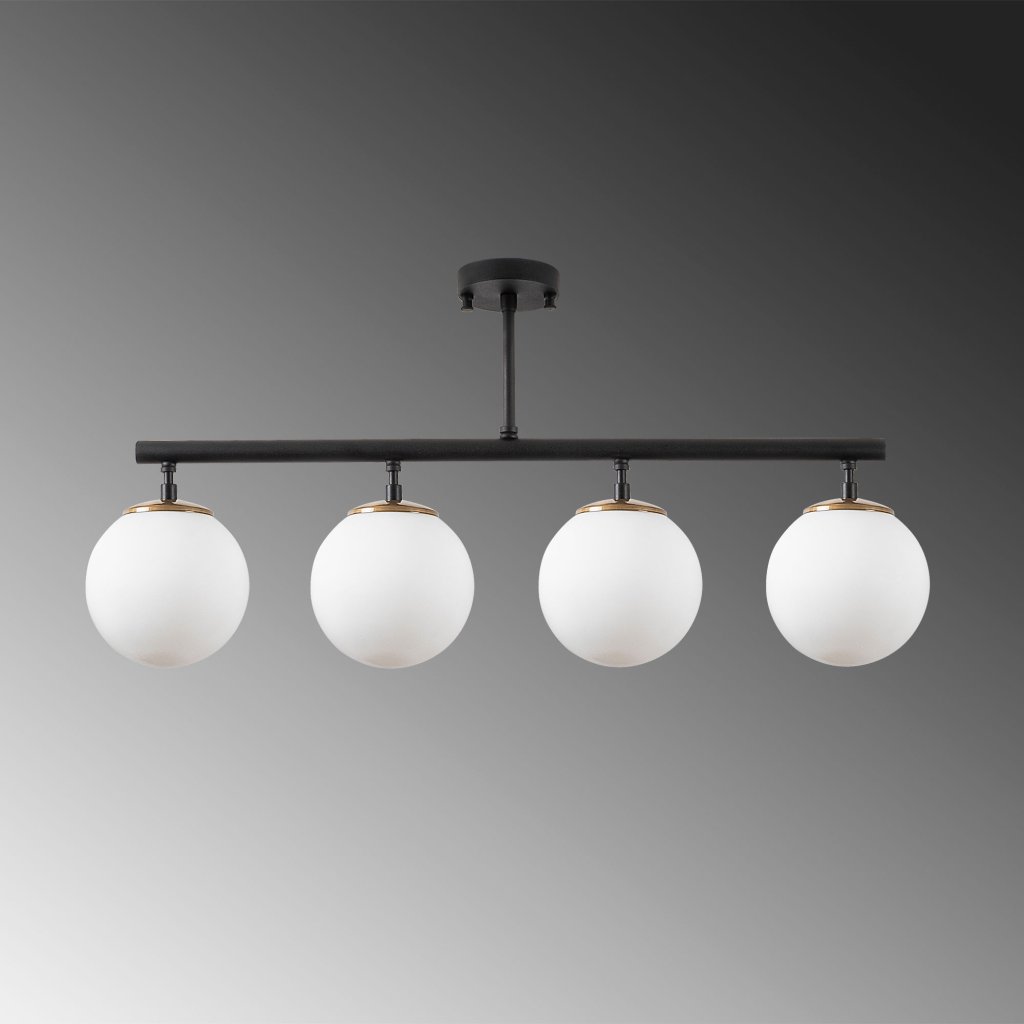 Stylové stropní světlo FAZLI od výrobce designových světel OPVIQ. FAZLI tvoří vrchní kovová krytka pro zakrytí kabelů a uchycení do stropu, ze které vychází černá kovová tyč. Na ni je kolmo připevněna samotná rozvodná černá kovová tyč se 4 bronzovými objímkami pro žárovky, které obklopují mléčné bílé koule s průměrem 15cm. Koule jsou umístěny rovnoměrně po celé délce tyče. Vzájemně vytváří velmi zajímavé a vkusné osvětlení, které vám bude každý závidět.
