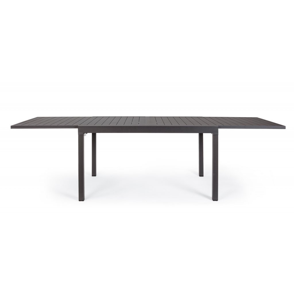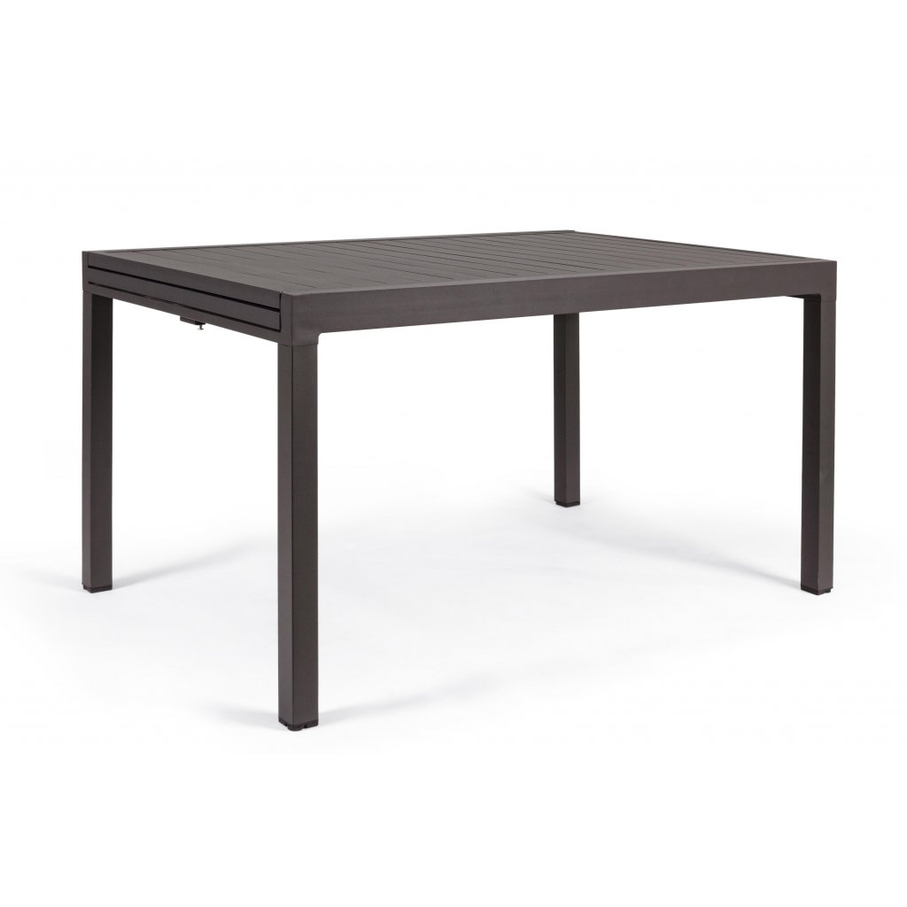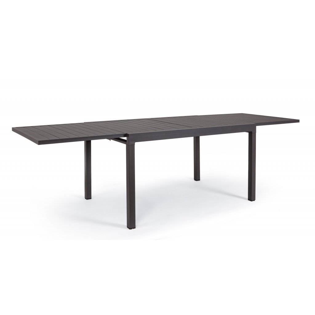 Rozkládací zahradní jídelní stůl PELAGIUS od italského výrobce stylového nábytku BIZZOTTO. Stůl je kompletně vyroben z tmavě stříkaného hliníku, což zajišťuje jeho maximální pevnost, stabilitu a pevnost vůči venkovním vlivům, ale také jeho poměrně nízkou váhu. Spojovací šrouby jsou galvanizovány, takže se nemusíme bát koroze. Stůl má 4 nohy, na nichž je rozkladatelná deska s délkou 135cm a možností jednoduchého prodloužení až na délku 270cm, takže krásně usadíte minimálně 8 osob.