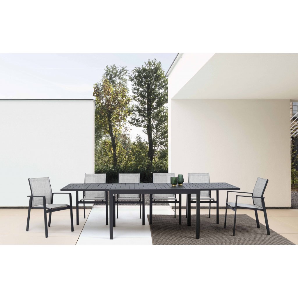 Rozkládací jídelní zahradní stůl PELAGIUS je velmi krásný a moderní prvek, stejně jako velmi praktický a to díky možnosti rozložit jeho desku. Velkou parádu vám udělá jak ve vaší zahradě, tak i na terase domu či bytu. Krásně doplníte třeba černě lakovanými zahradními židlemi v podobném barevném provedení.
