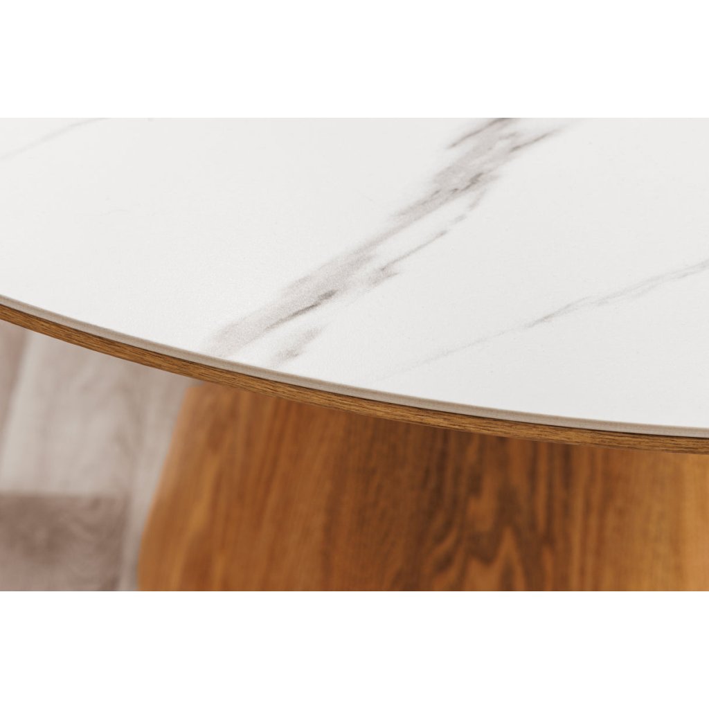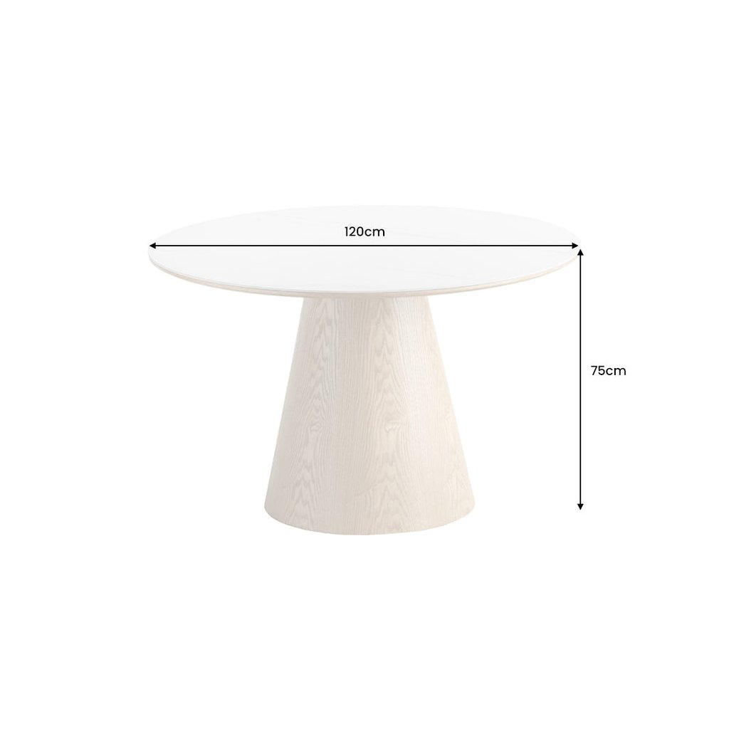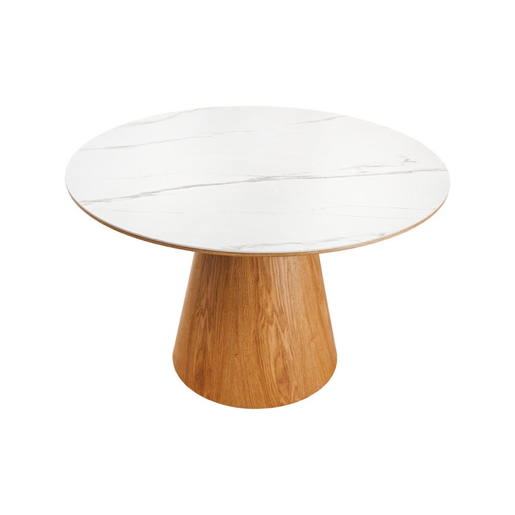 Designový kulatý jídelní stůl UNIQUE od německé značky krásného nábytku INVICTA. Kulatý stůl s keramickou deskou v kombinaci bílé a světlé barvy je elegantním a funkčním doplňkem moderního interiéru. Základna stolu je vyrobena z kombinace MDF , dubové dýhy světlé barvy a keramické desky v provedení bílého mramoru. Válcovitá dřevěná noha zajišťuje stabilitu a podtrhuje nadčasový design. Díky praktickému kulatému tvaru o průměru 120 cm je stolek ideální vaší jídelny či kuchyně.