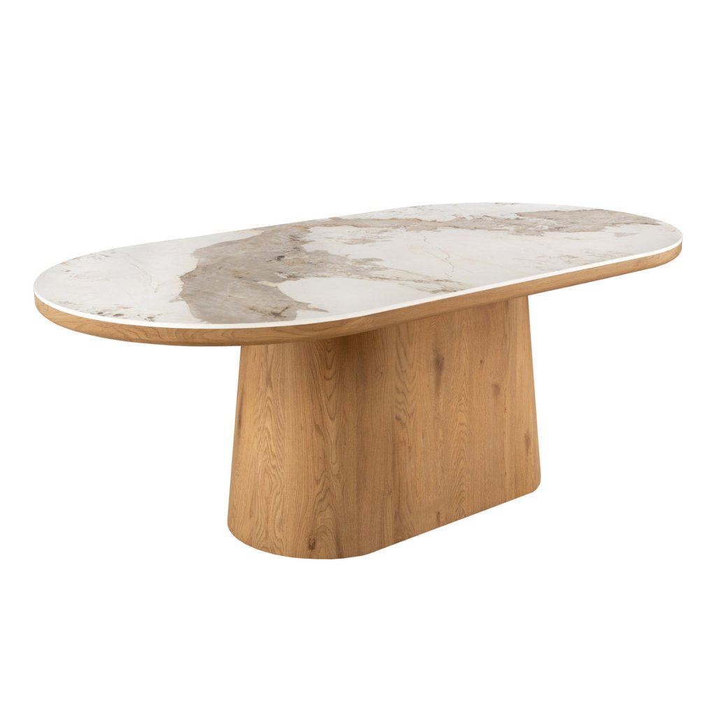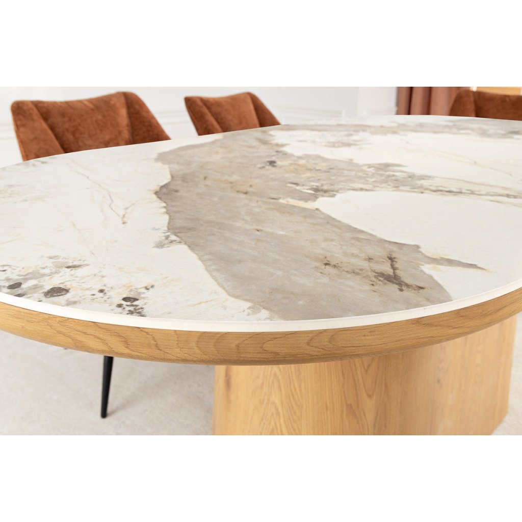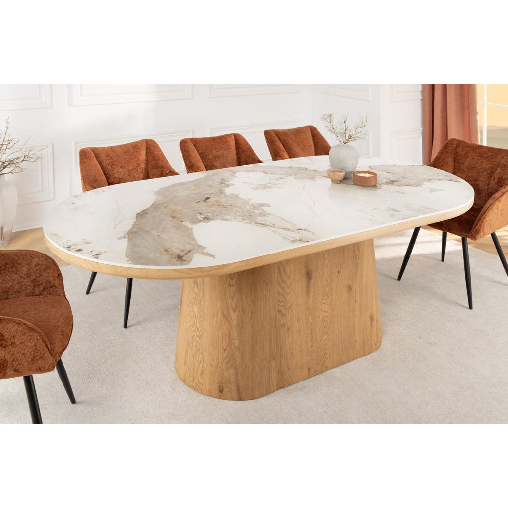 Designový jídelní stůl UNIQUE od německé značky krásného nábytku INVICTA. Oválný stůl s keramickou deskou v kombinaci bílé a světlé barvy je elegantním a funkčním doplňkem moderního interiéru. Základna stolu je vyrobena z kombinace MDF , dubové dýhy světlé barvy a keramické desky v provedení bílého mramoru. Masivní dřevěná noha zajišťuje stabilitu a podtrhuje nadčasový design. Díky velkorysým rozměrům 200x100 cm se k němu vejde i velká rodina.