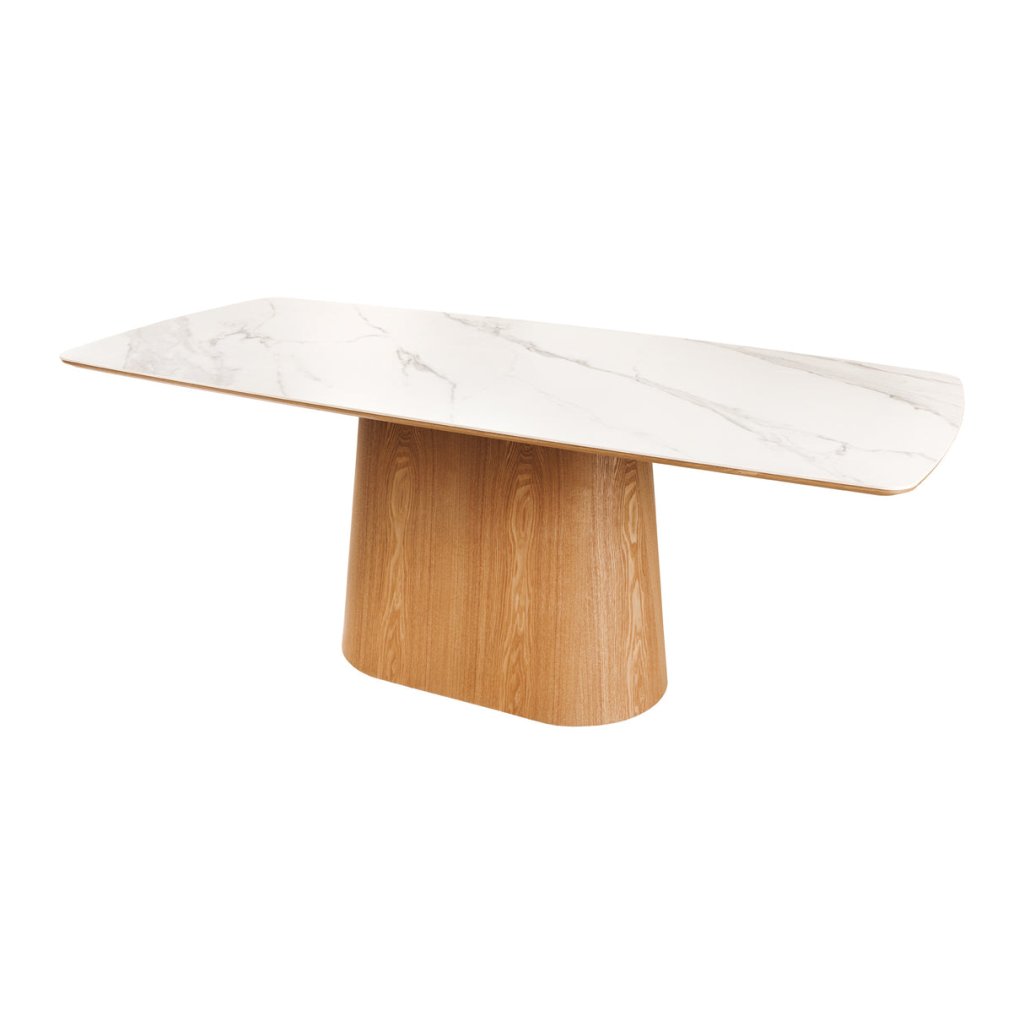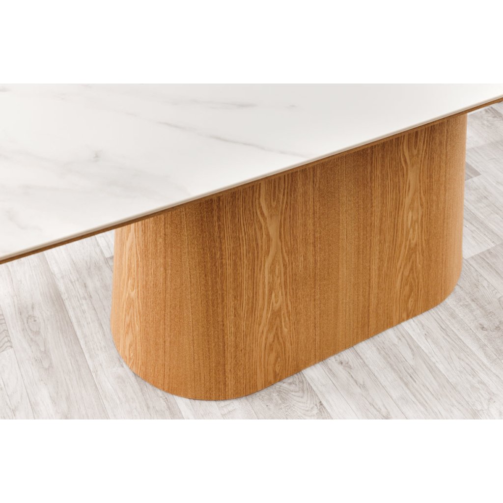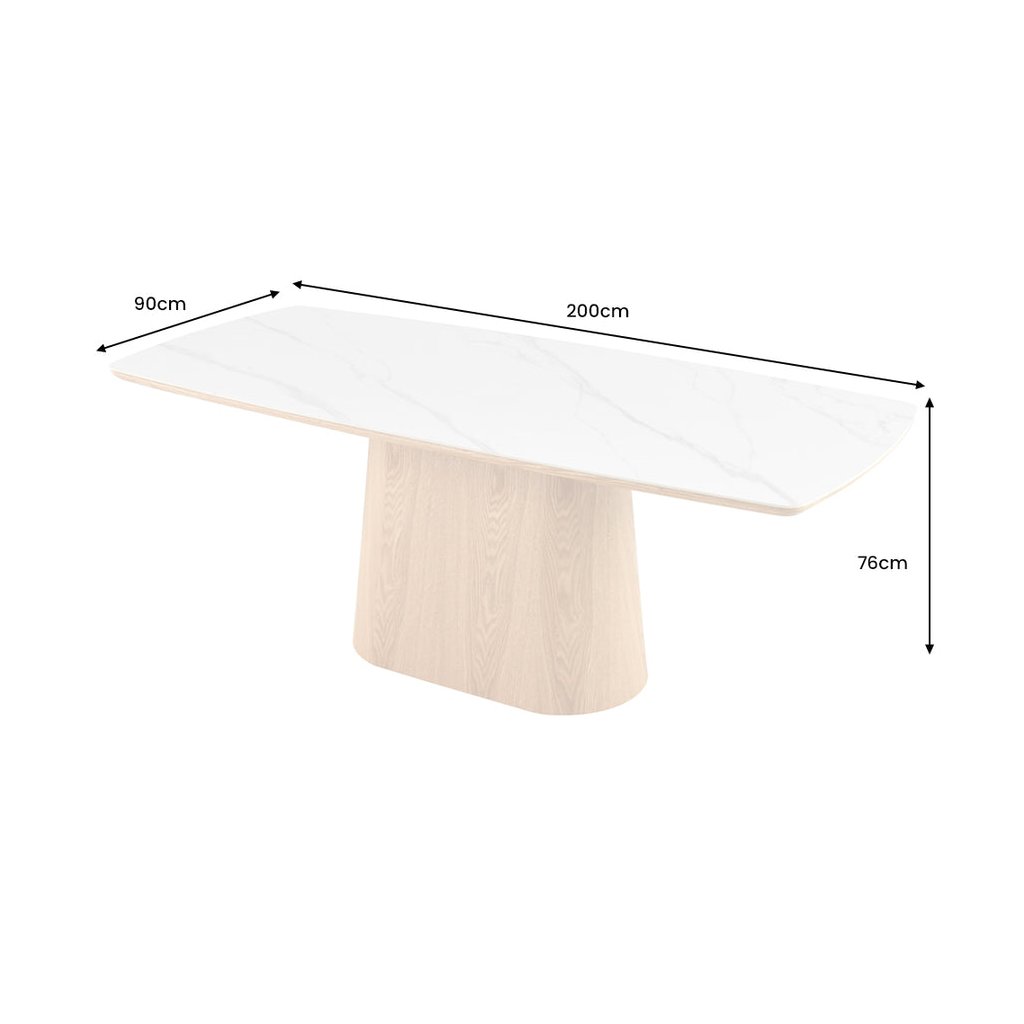 Designový jídelní stůl UNIQUE od německé značky krásného nábytku INVICTA. Obdélníkový stůl s keramickou deskou v kombinaci bílé a světlé barvy je elegantním a funkčním doplňkem moderního interiéru. Základna stolu je vyrobena z kombinace MDF , dubové dýhy světlé barvy a keramické desky v provedení bílého mramoru. Masivní dřevěná noha zajišťuje stabilitu a podtrhuje nadčasový design. Díky velkorysým rozměrům 200x90 cm se k němu vejde i velká rodina.