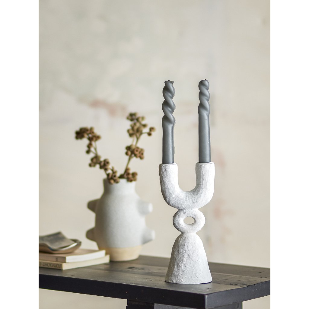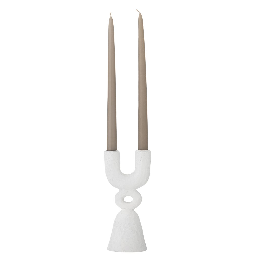 Designový svícen SYRA od dánské značky skandinávského nábytku a doplňků BLOOMINGVILLE. Svícen SYRA je unikátní svícen, který je vyroben z polyresinu (umělé pryskyřice) v bílém provedení. Jeho jedinečný design s dvojitým svícnem a grafickými detaily vytváří poutavou dekoraci, která dodá umělecký rozměr každé místnosti. Ideální jako výrazný prvek do obývacího pokoje, chodby nebo na jídelní stůl.