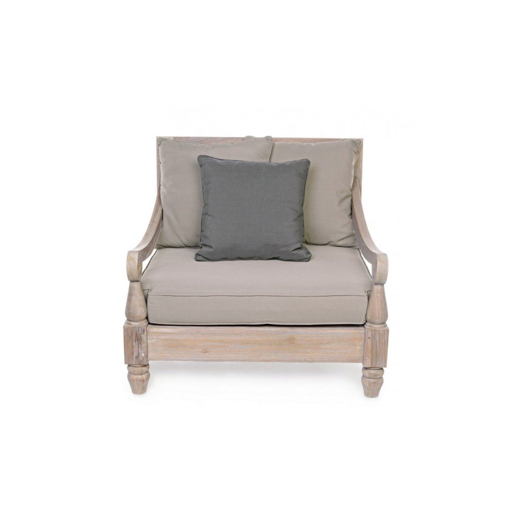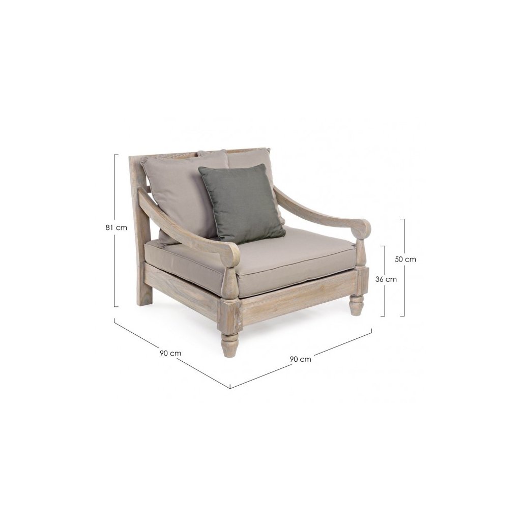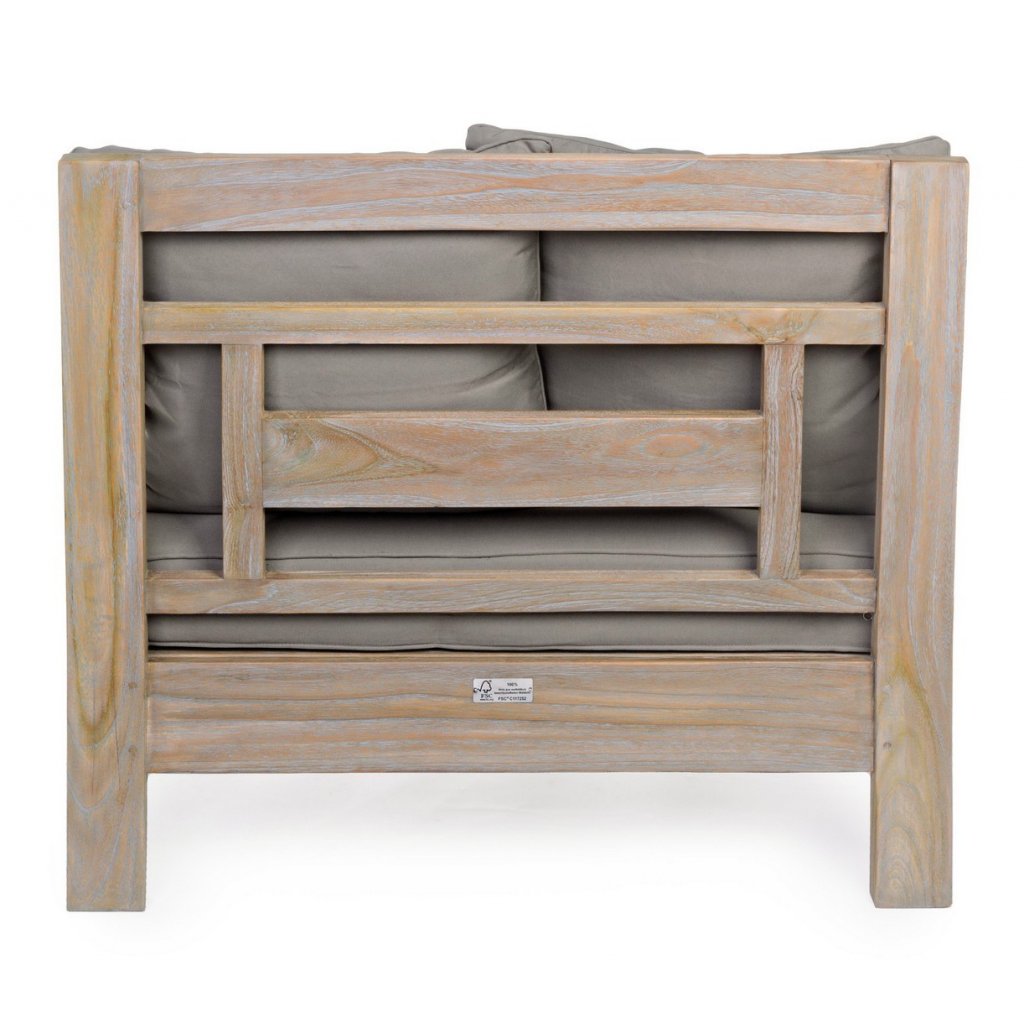 Designové teakové křeslo BALI od italského výrobce stylového nábytku BIZZOTTO. Křeslo má rám z masivního teakového dřeva, který tvoří sedák, 2 opěrky pro ruce, zadní opěrka a 4 masivní nohy. Teakové dřevo nese certifikaci FSC, což značí ekologickou a pro přírodu šetrnou těžbu dřeva. Vše dále pokryto spodním polštářkem a polštářky na opření s povlakem z odolného olefinu. Dřevo je charakteristické svými původními rysy, jako jsou malinké prasklinky a menší nedokonalosti, každý kousek nábytku je díky tomu svým způsobem unikátní a jedinečný. Nedoporučuje se vystavovat křeslo přímému slunečnímu záření a extrémním vlivům špatného počasí.
