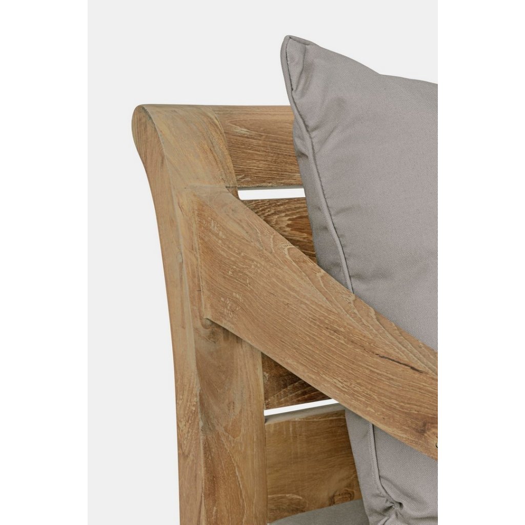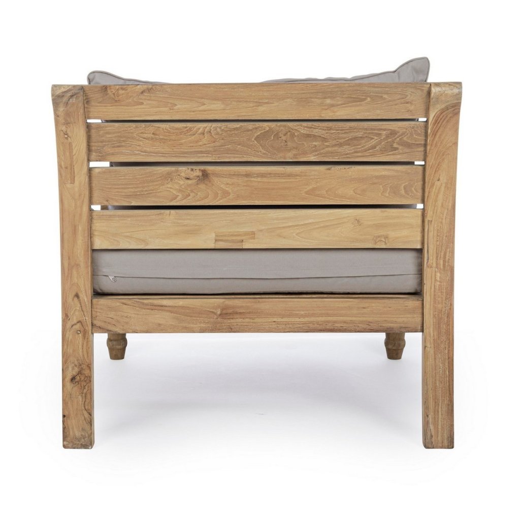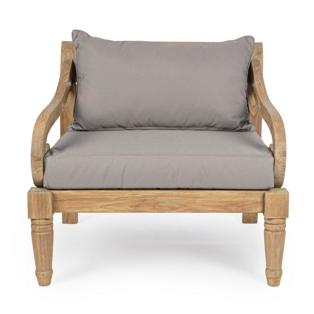 Designové teakové křeslo KARUBA od italského výrobce stylového nábytku BIZZOTTO. Křeslo má rám z masivního teakového dřeva, který tvoří sedák, 2 opěrky pro ruce, zadní opěrka a 4 masivní nohy. Teakové dřevo nese certifikaci FSC, což značí ekologickou a pro přírodu šetrnou těžbu dřeva. Vše dále pokryto spodním polštářkem a polštářky na opření s povlakem z odolného olefinu