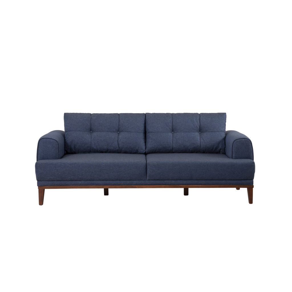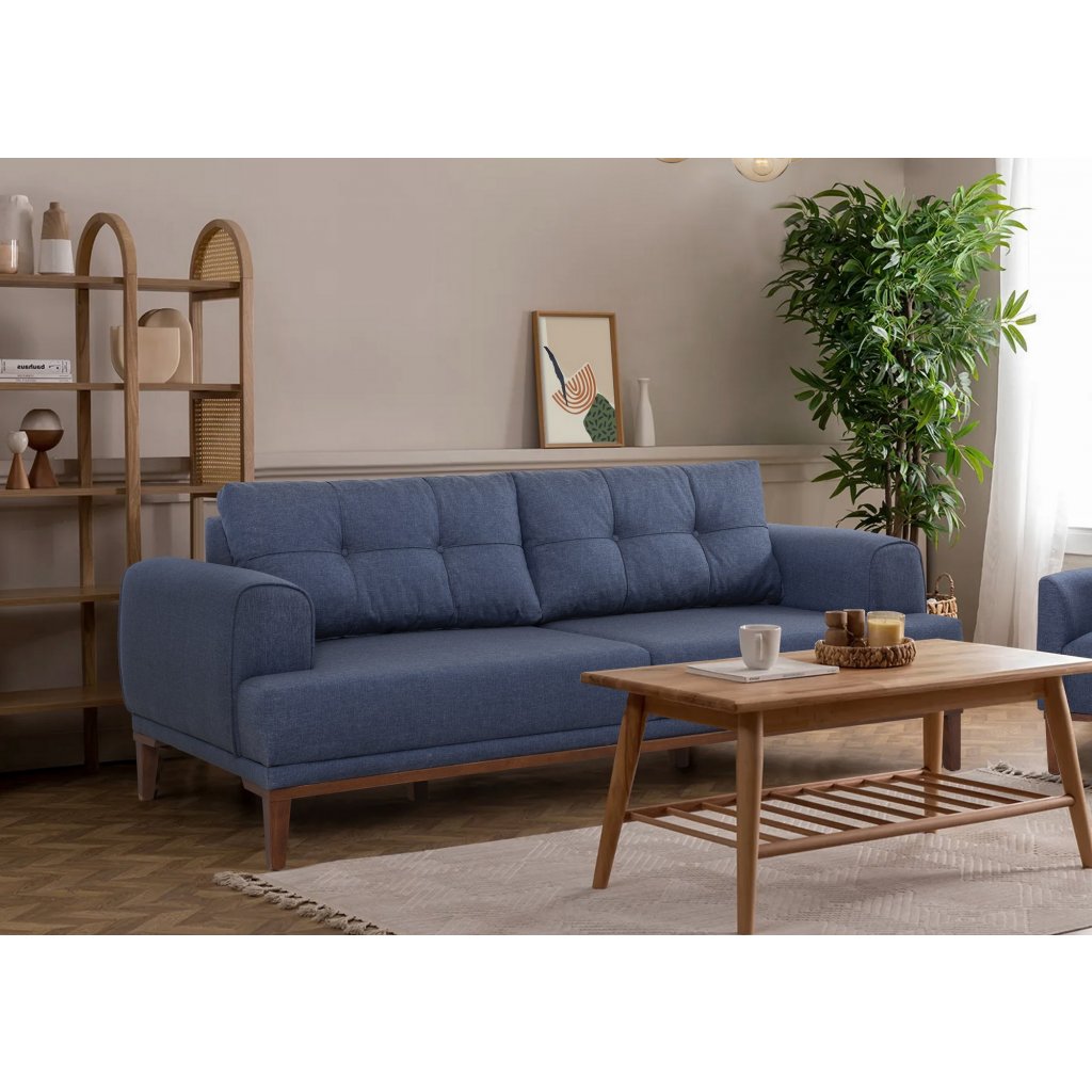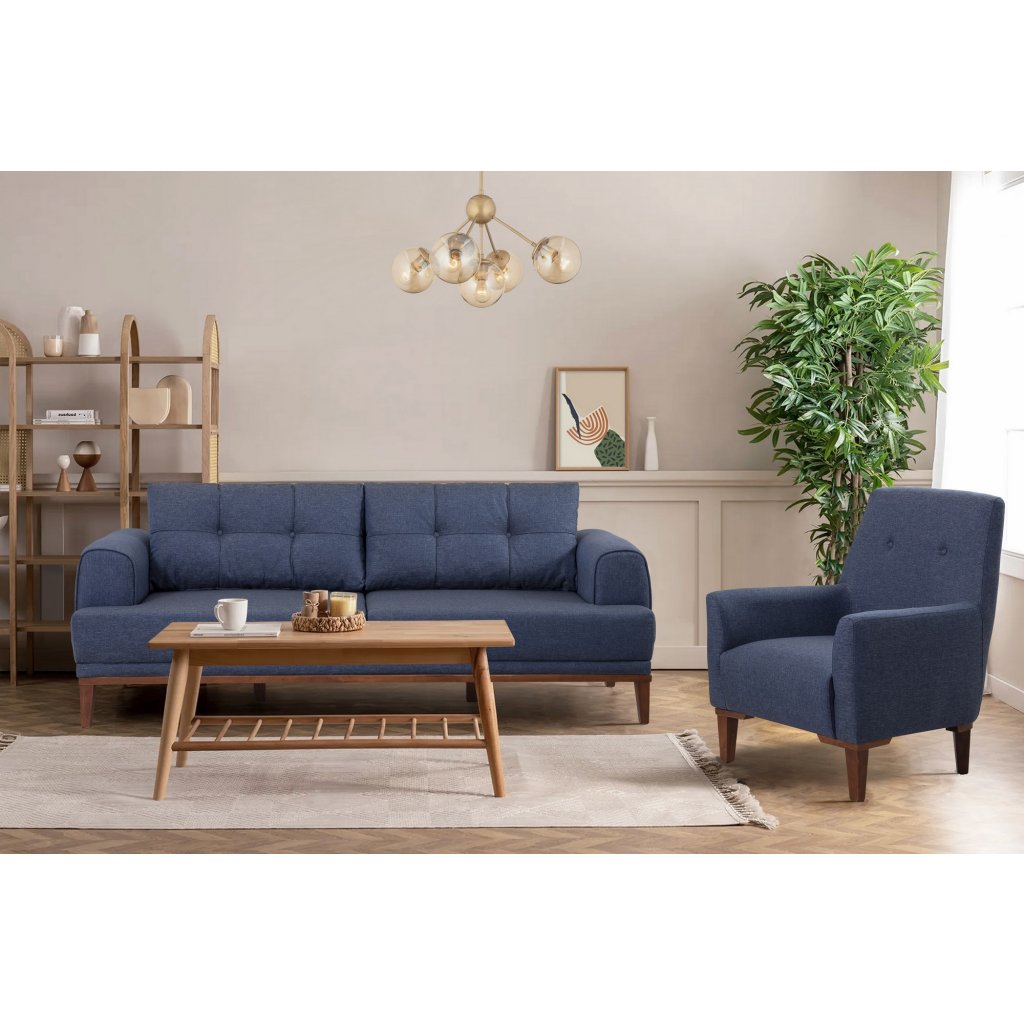 Designová třímístná pohovka s křeslem BALERA od výrobce nábytku a pohovek Hanah Home. Pohovka a křeslo BALERA vás zaručeně zaujmou na první pohled. Velice stylová pohovka vás osloví nejen kvalitním zpracováním, ale také svým minimalistickým designem. Rám pohovky i křesla je kompletně vyroben z habrového dřeva. Krásná tmavě modrá látka je ze 100% lnu. Sedák je vyplněn pěnou. Pohovka bude skvělým místem pro odpočinek a relaxaci. Díky velmi praktickému křeslu získáte opravdu dokonalý interiér.