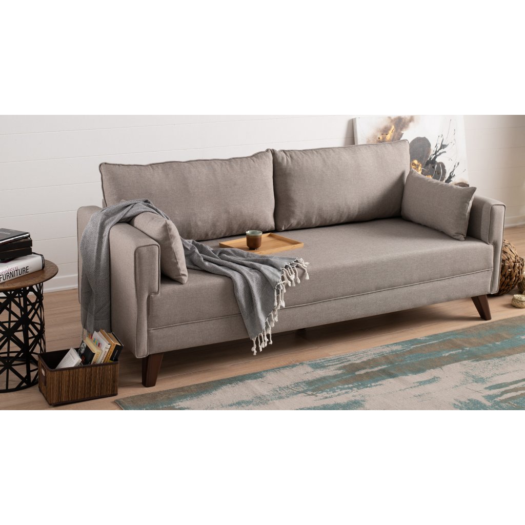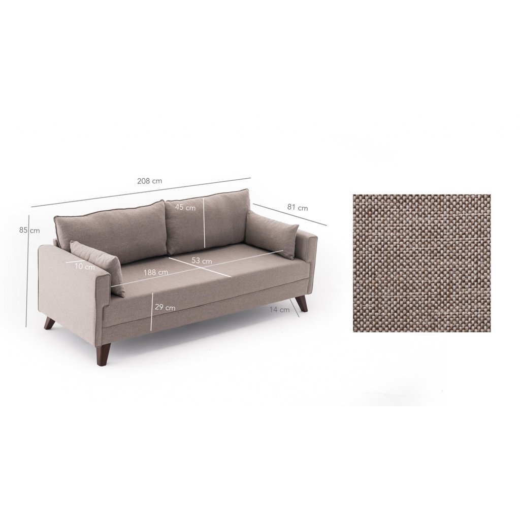 Designová pohovka BELLA od výrobce nábytku a pohovek Hanah Home. Krásná elegantní sedačka má 5 malých nohou, které přechází do rámu sedačky z bukového dřeva. Rám je potažen kvalitními pěnami díky nimž je sezení velmi příjemné a komfortní. Vaše pohodlí vám zajistí krásný a odolný látkový potah z polyesterových vláken v krémové barvě. Na sedačku se pohodlně vejdou minimálně 3 osoby. Pohovka je opatřena 2 velkými a 2 malými polštáři, na opěradle a bocích.