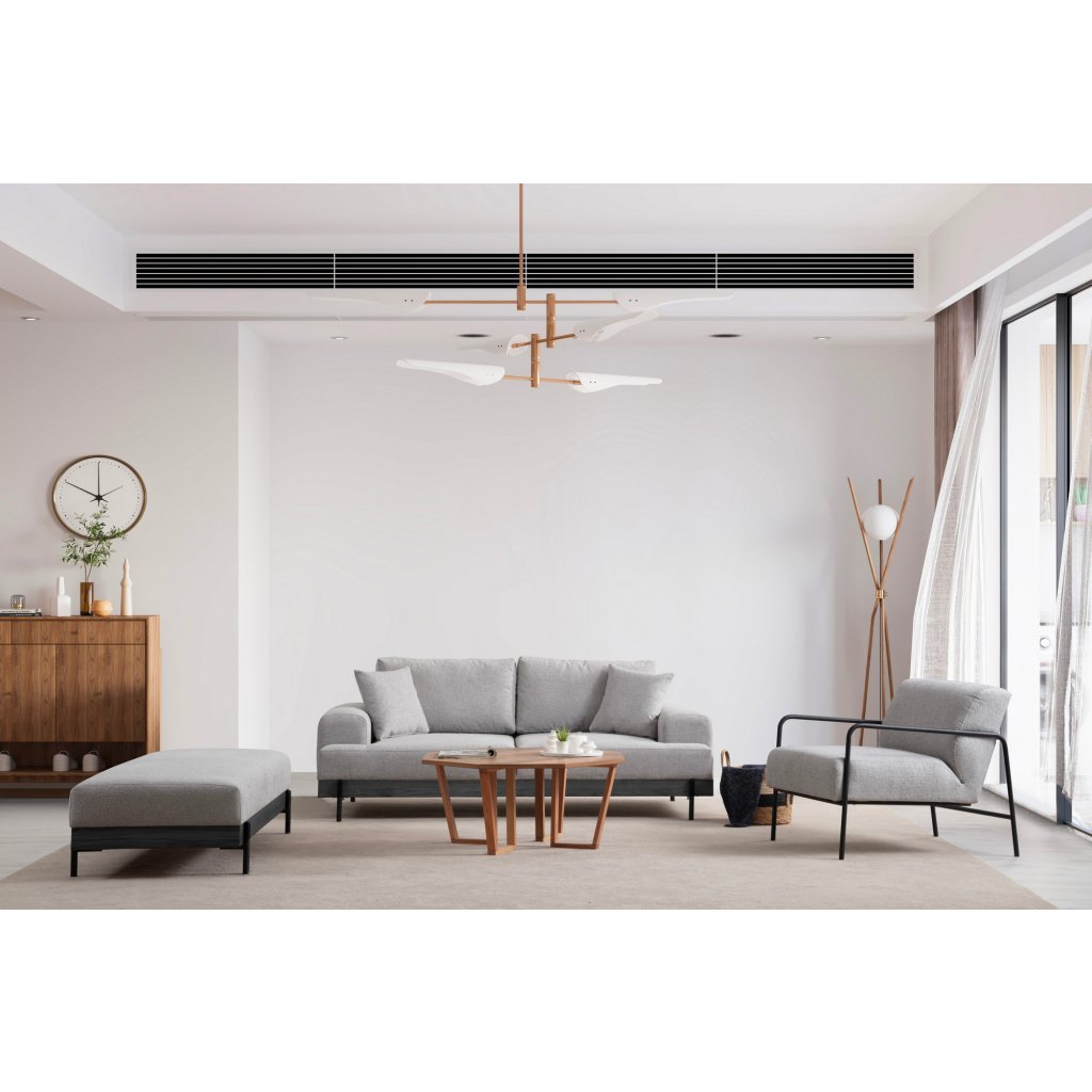 Pohovka ETI je čalouněná látkou v šedém odstínu a výborně tak doplní moderně zařízené interiéry, do kterých vnese útulnou atmosféru. ETI vynikne ve světlých i tmavých prostorech. Váš obývací pokoj perfektně doladíte nábytkem z kovu nebo s kovovými doplňky. Pohovka je dostupná také v jiných variantách.