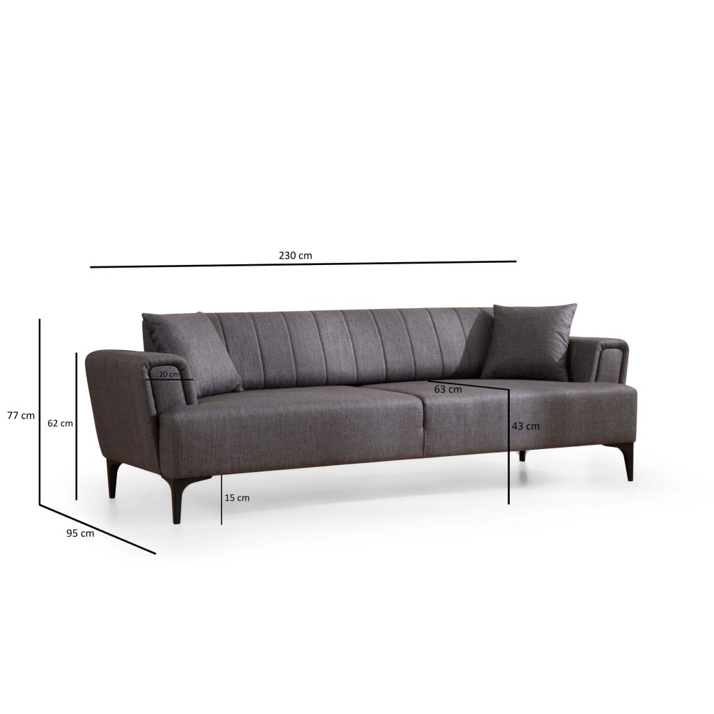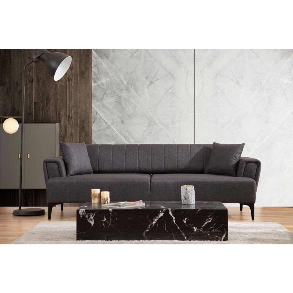Designová třímístná pohovka HAMLET od výrobce nábytku a pohovek Hanah Home. Pohovka HAMLET vás zaručeně zaujme na první pohled. Velice stylová pohovka vás osloví nejen kvalitním zpracováním, ale také svým minimalistickým designem. Rám je vyroben z kombinace bukového dřeva a dřevotřísky. Krásná tmavě šedá látka je ze 100% polyesteru. Sedák je vyplněn pěnou. Pohovka bude skvělým místem pro odpočinek a relaxaci. Díky otočnému zádovému mechanismu je pohovka rozkládací.
