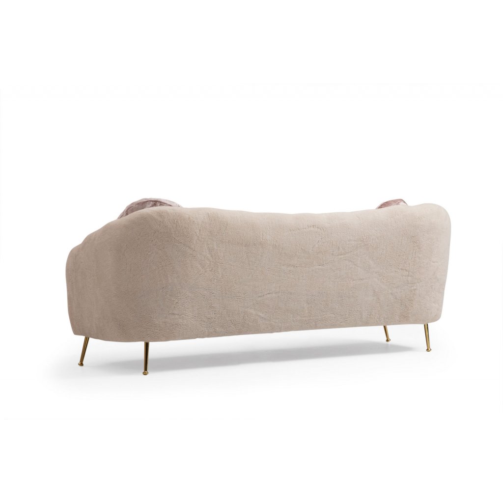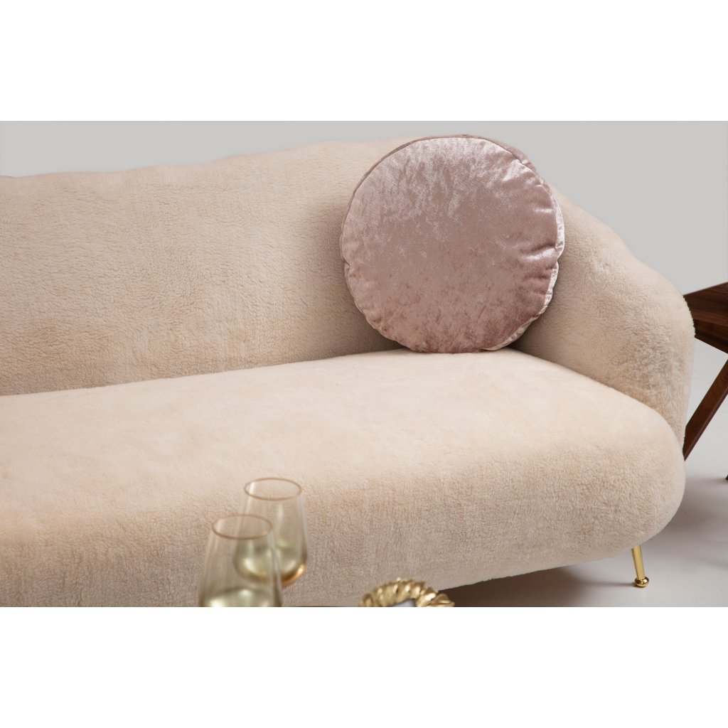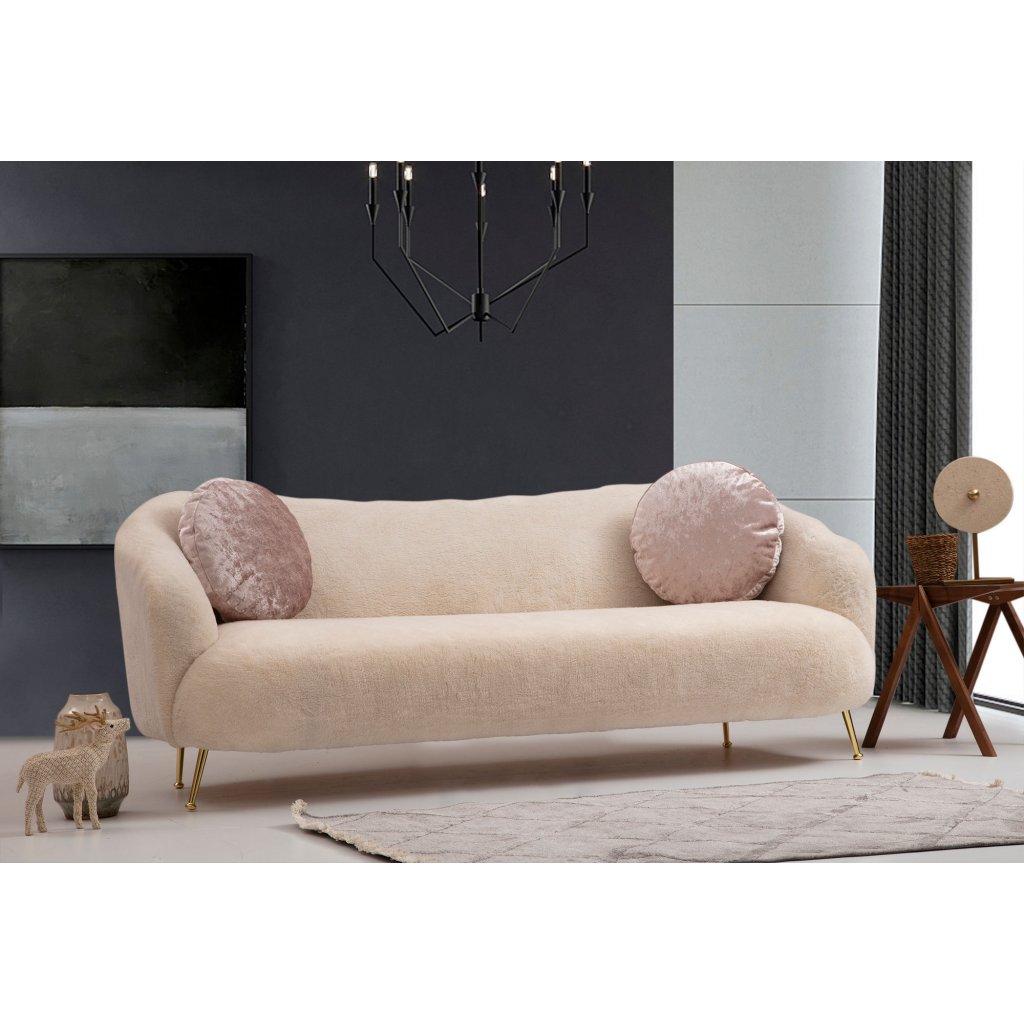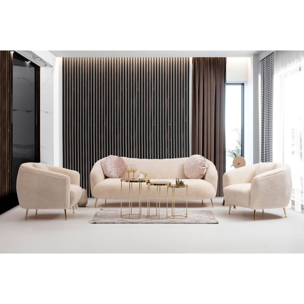 Designová pohovka ISTIRIDYE od výrobce nábytku a pohovek Hanah Home. Krásná elegantní sedačka má unikátní vzhled a to díky krásnému béžovému potahu a zaobleným tvarům zadní opěrky. Díky délce 215 cm se na ni vejdou 3 osoby. Má konstrukci z bukového dřeva, pevnou pěnu a finální krásný bílý bouclé potah.