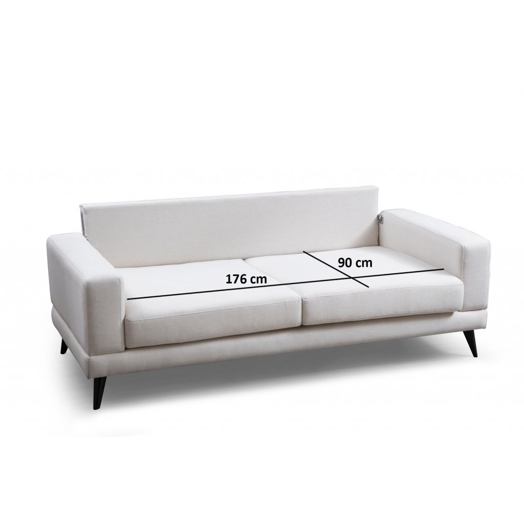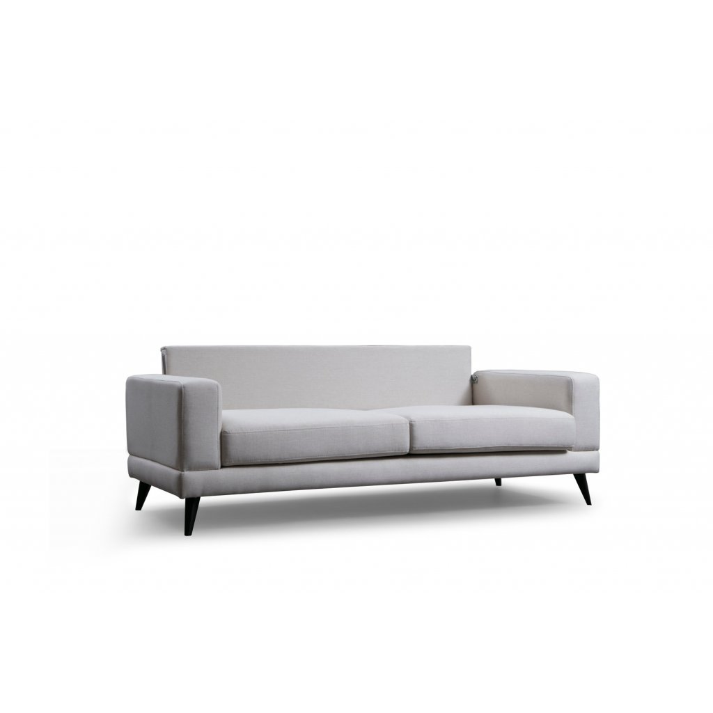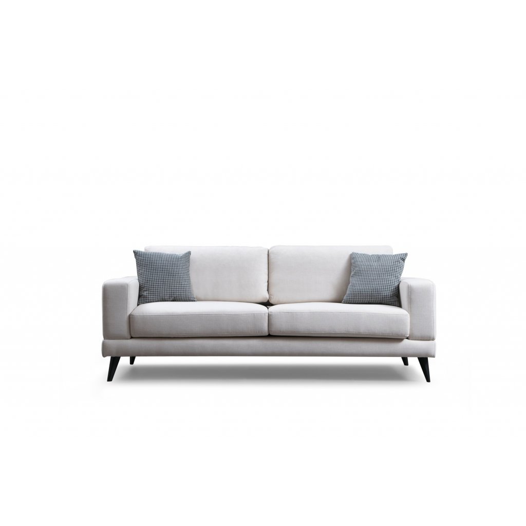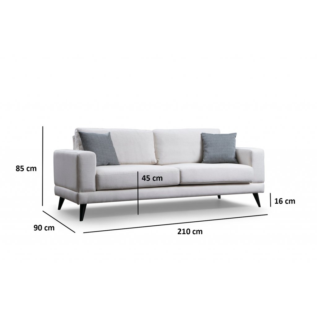 Krásná pohovka NORDIC od výrobce nábytku a pohovek Hanah Home. Pohovka NORDIC je dodávána s bukovou dřevěnou konstrukcí, polyuretanovou výplní, nohami s pevného plastu a povlakem ze 100% polyesteru v béžové barvě. Pohovka NORDIC je k dostání i v dalších barevných variantách. Na sedačku se pohodlně vejdou tři osoby. Obsahuje dva polštářky s rozměry 45x45 cm v šedé barvě.
