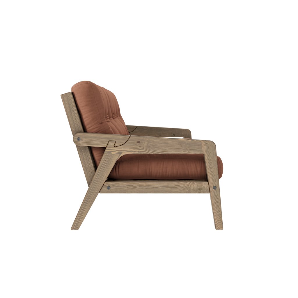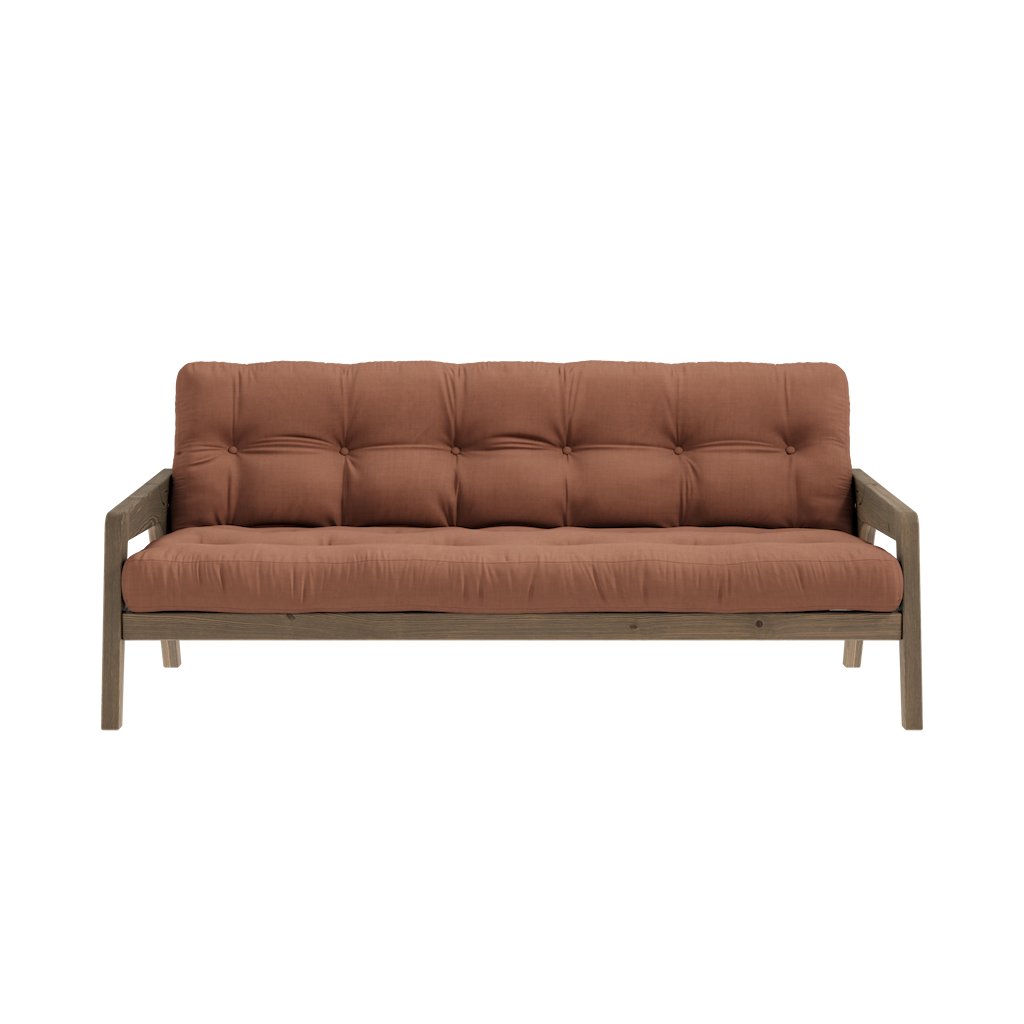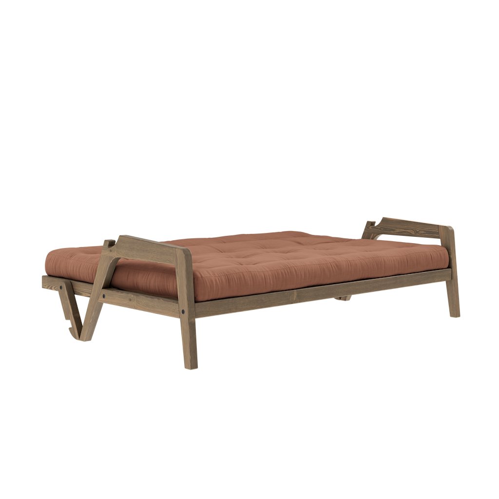 Stylová rozkládací pohovka GRAB od výrobce nábytku a pohovek KARUP DESIGN. Pohovka je dodávána z vysoce kvalitního borovicového dřeva s certifikací FSC ve tmavém provedení a výplní futonové matrace z pěny, kterou pokrývá polyesterový povlak v hliněno hnědé barvě. Moderní design, precizní zpracování a elegantní nohy dodávají pohovce GRAB styl i funkčnost, kterou od rozkládací pohovky očekáváte. Délka 204 cm zajišťuje že se na pohovku vejdou až 3 osoby. Při snadném rozložení získáte místo na spaní s rozměry až 204x130 cm, což zajistí dostatečný prostor pro přespání vaší návštěvy.