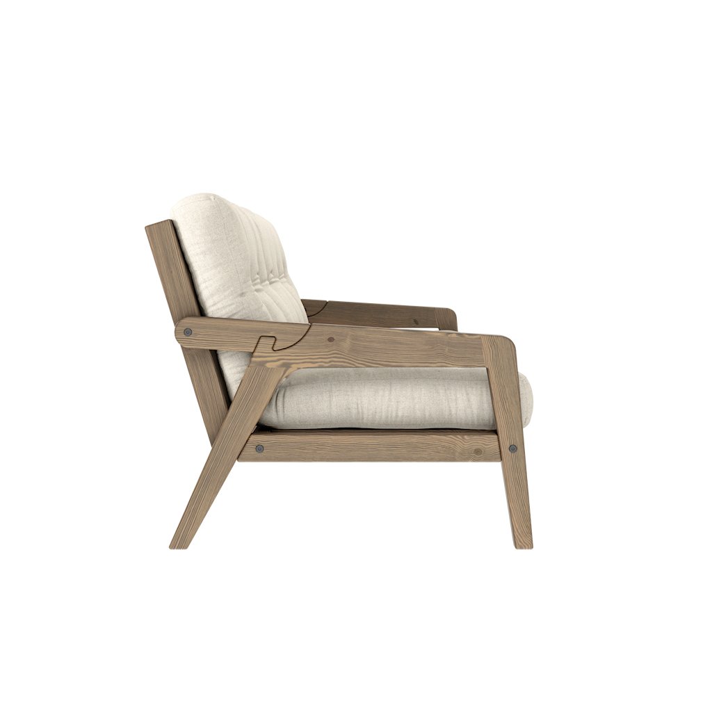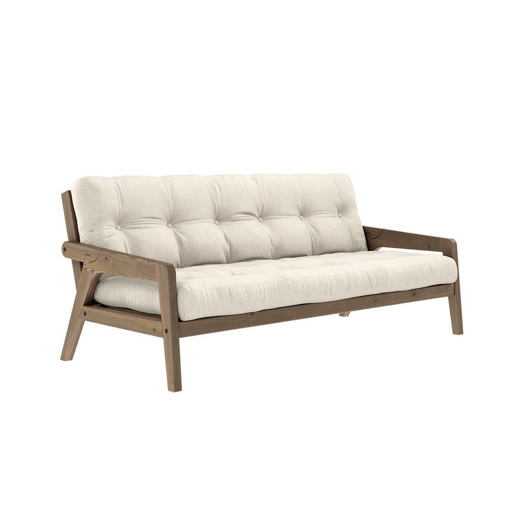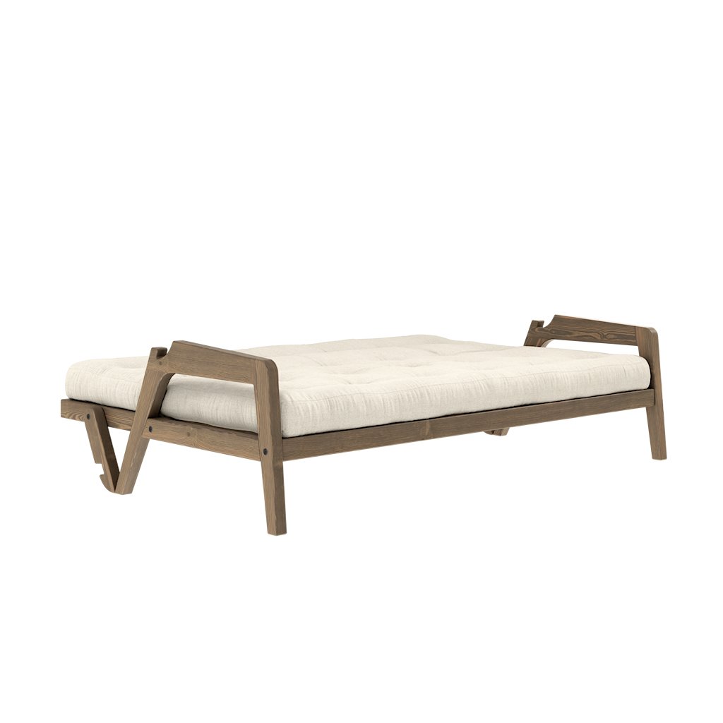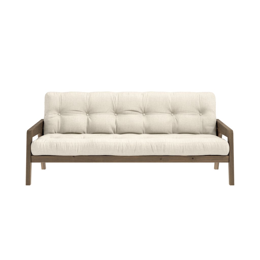 Stylová rozkládací pohovka GRAB od výrobce nábytku a pohovek KARUP DESIGN. Pohovka je dodávána z vysoce kvalitního borovicového dřeva s certifikací FSC ve tmavém provedení a výplní futonové matrace z pěny, kterou pokrývá polyesterový povlak ve lněné barvě. Moderní design, precizní zpracování a elegantní nohy dodávají pohovce GRAB styl i funkčnost, kterou od rozkládací pohovky očekáváte. Délka 204 cm zajišťuje že se na pohovku vejdou až 3 osoby. Při snadném rozložení získáte místo na spaní s rozměry až 204x130 cm, což zajistí dostatečný prostor pro přespání vaší návštěvy.